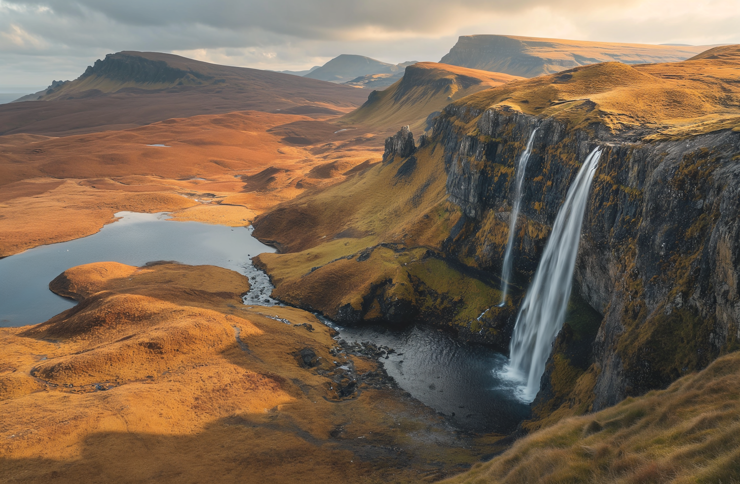 Majestic waterfall cascading into a serene pool amidst golden-brown hills and rugged cliffs under an overcast sky.