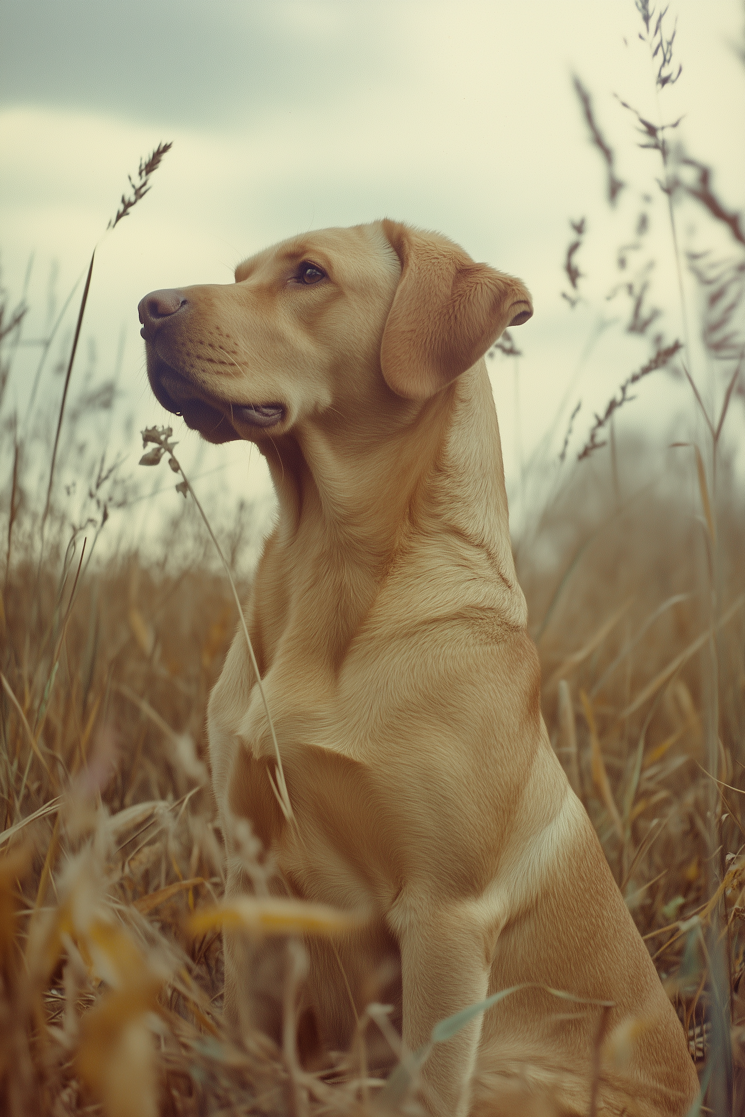 Golden Labrador Retriever sitting in tall grass, exuding calm and alertness. Warm tones and overcast sky create a serene, natural setting.