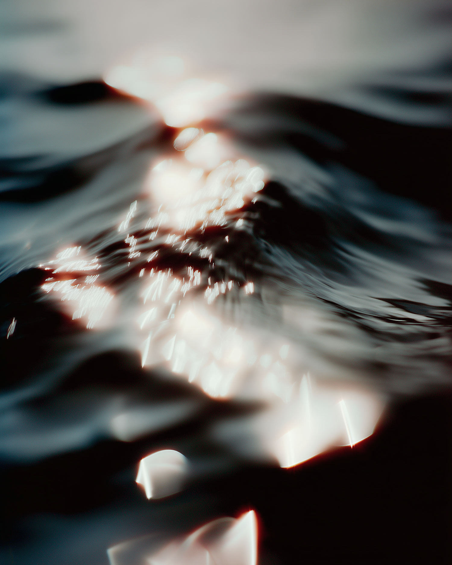 Dreamy close-up of shimmering light reflections on dark, rippling water, creating a tranquil and abstract visual effect.