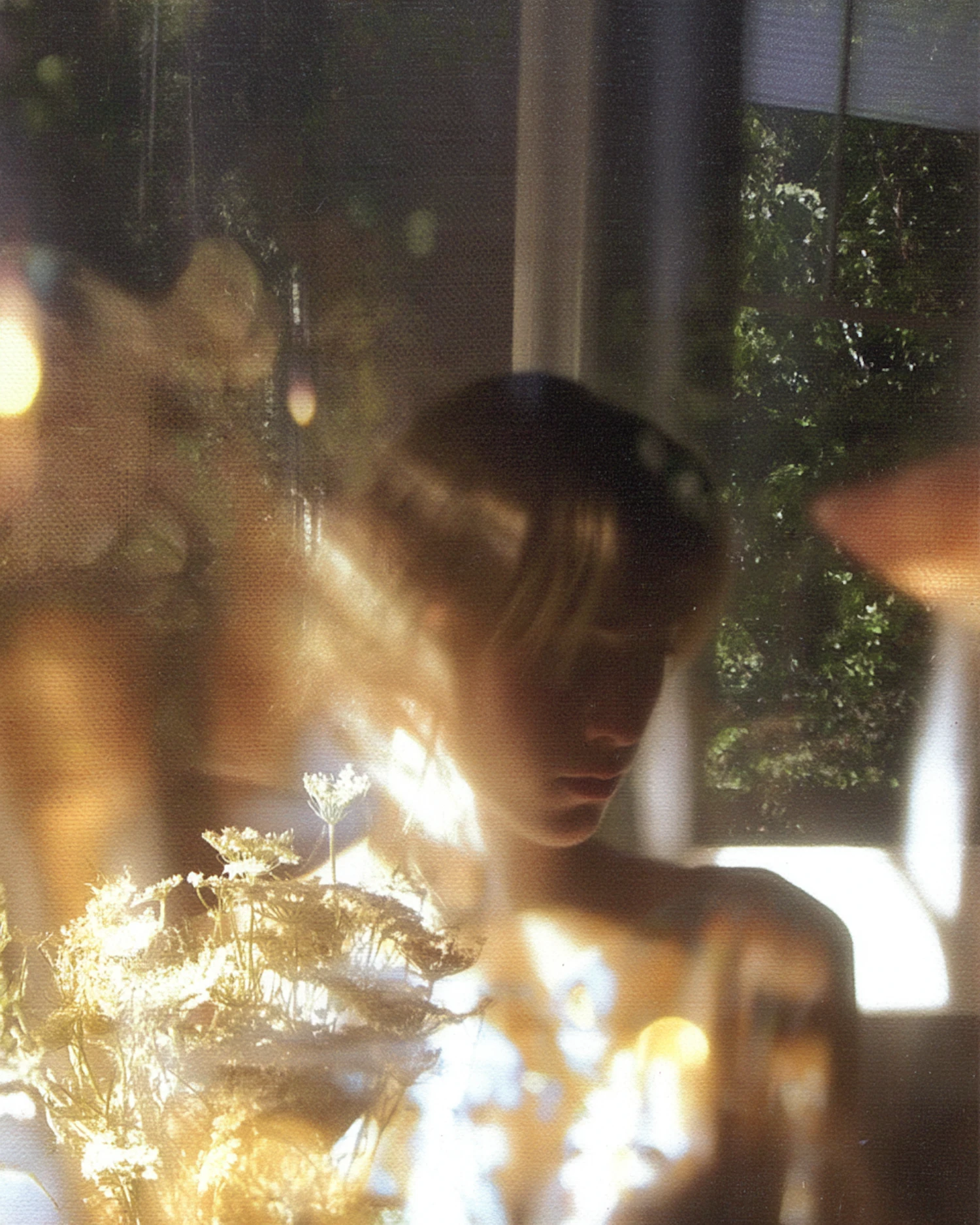 A dreamy portrait with soft light, flowers, and a serene atmosphere, blending natural and human elements in a tranquil setting.