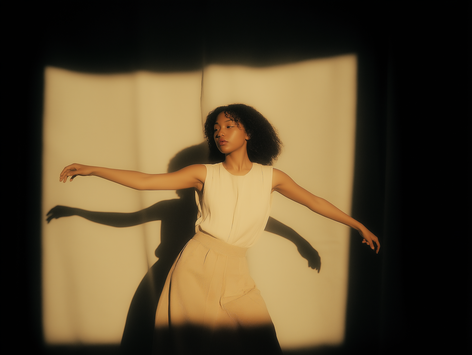 A serene capture of a person in a posing dance, gracefully moving in golden light, surrounded by soft shadows and showcasing elegant simplicity.