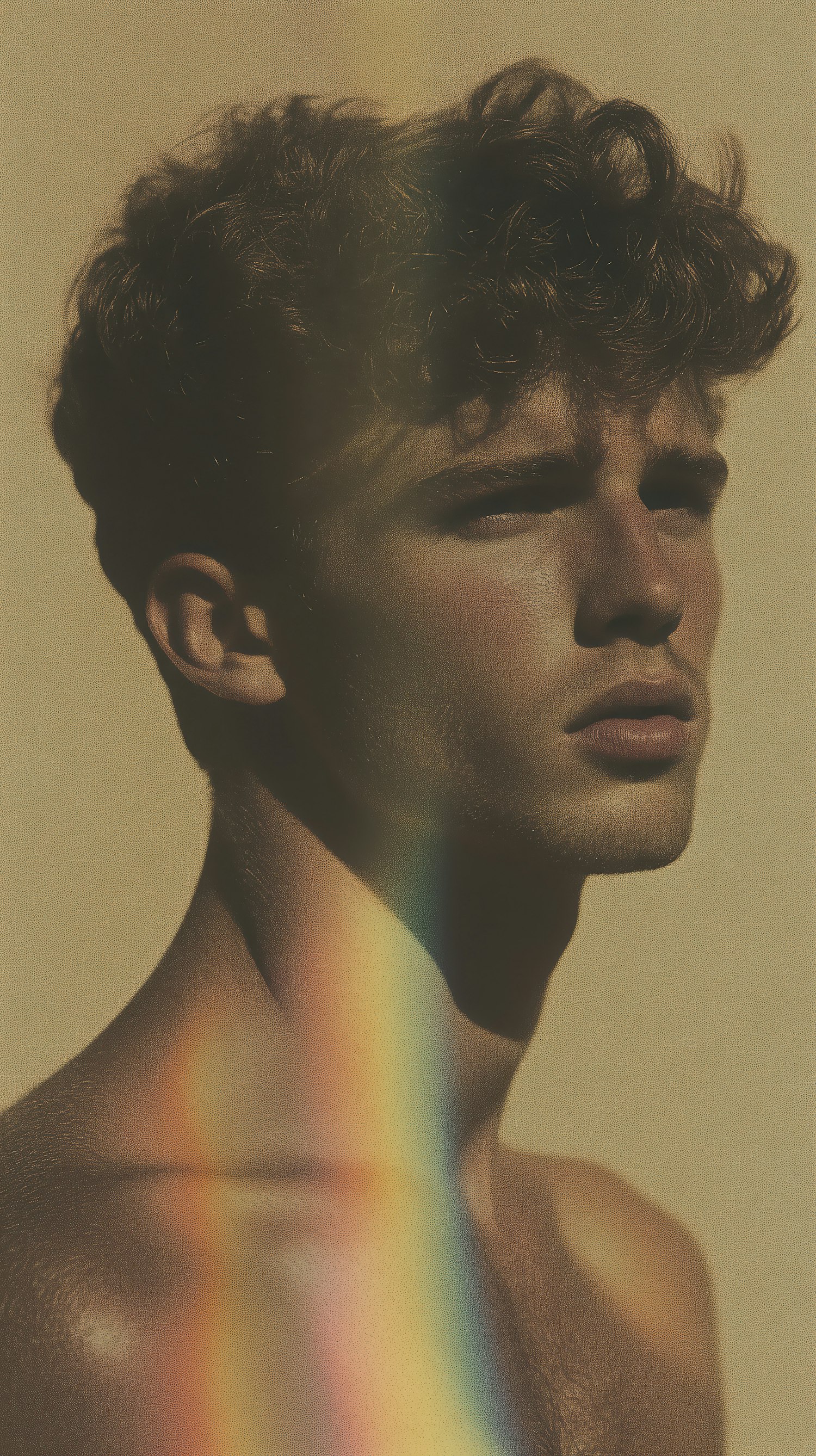 Portrait of a young man with curly brown hair and a rainbow light effect, set against a warm beige background.