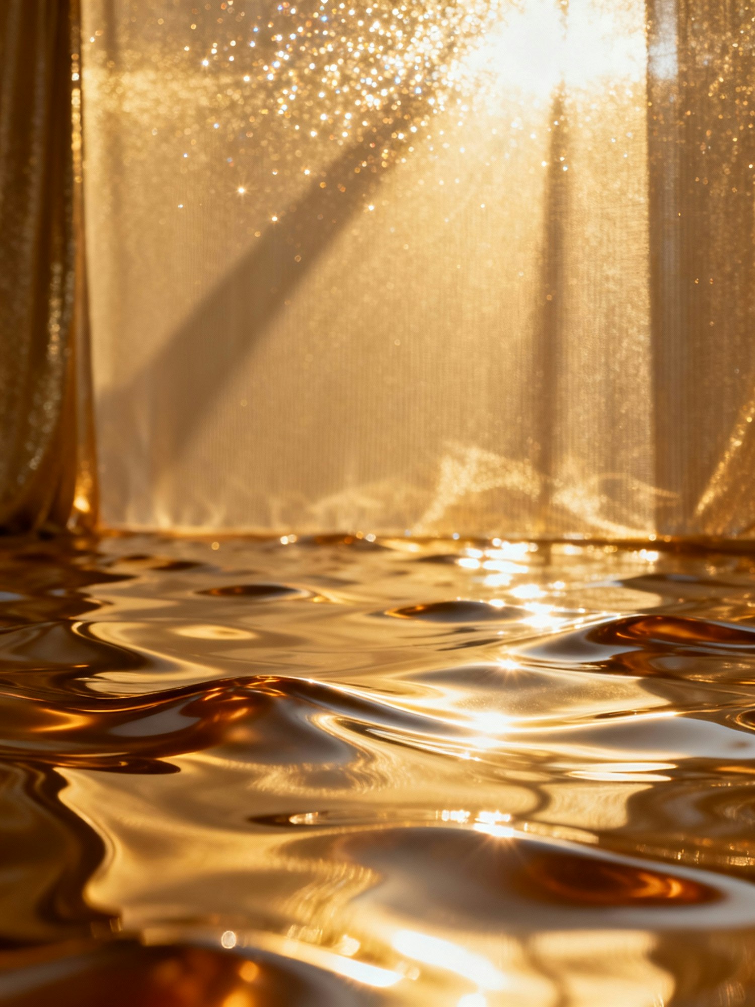 Golden light reflects on rippling liquid with a shimmering curtain backdrop, creating a serene and luxurious visual effect.