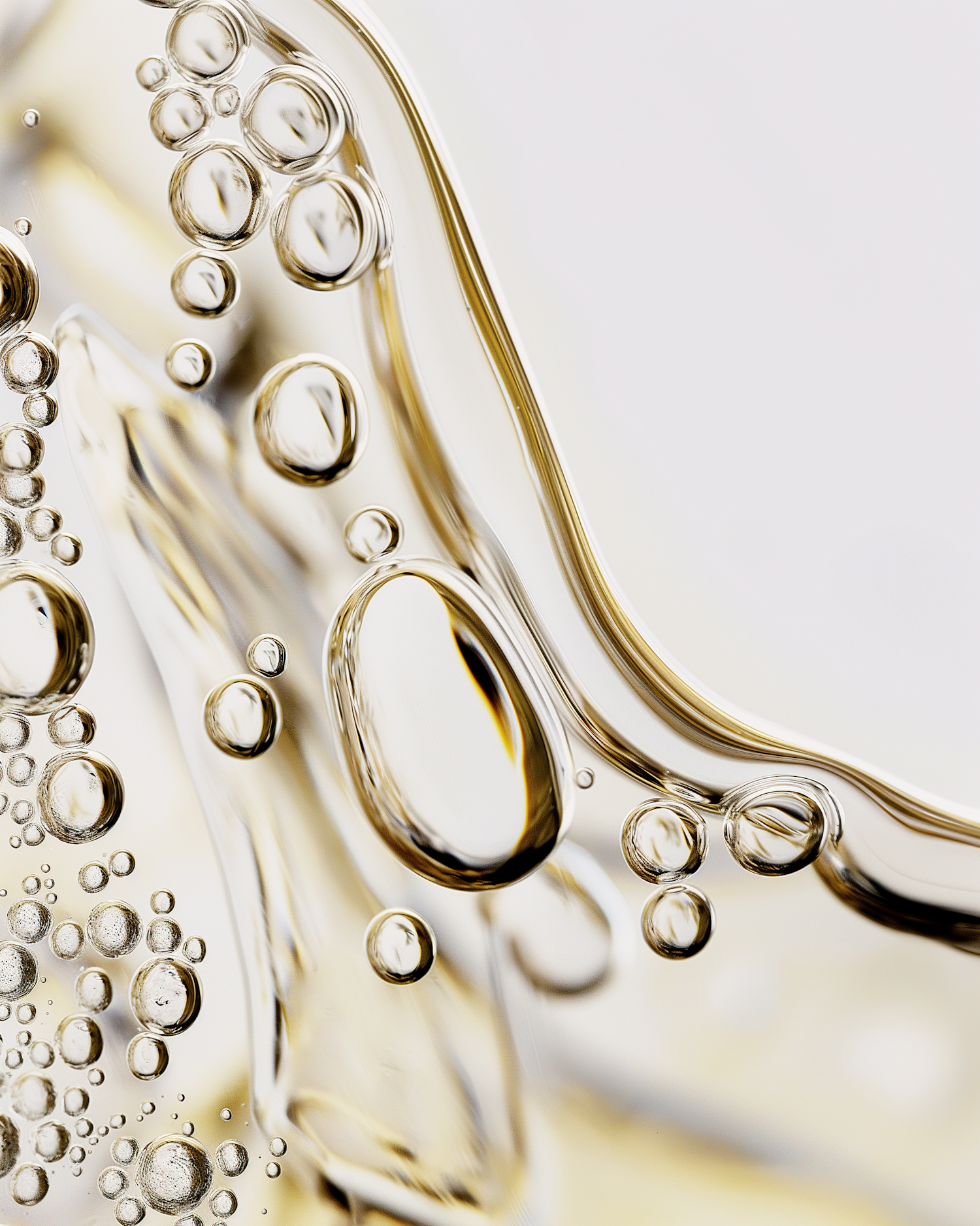 Abstract close-up of golden liquid with suspended air bubbles, creating a luxurious and glossy texture with flowing lines.