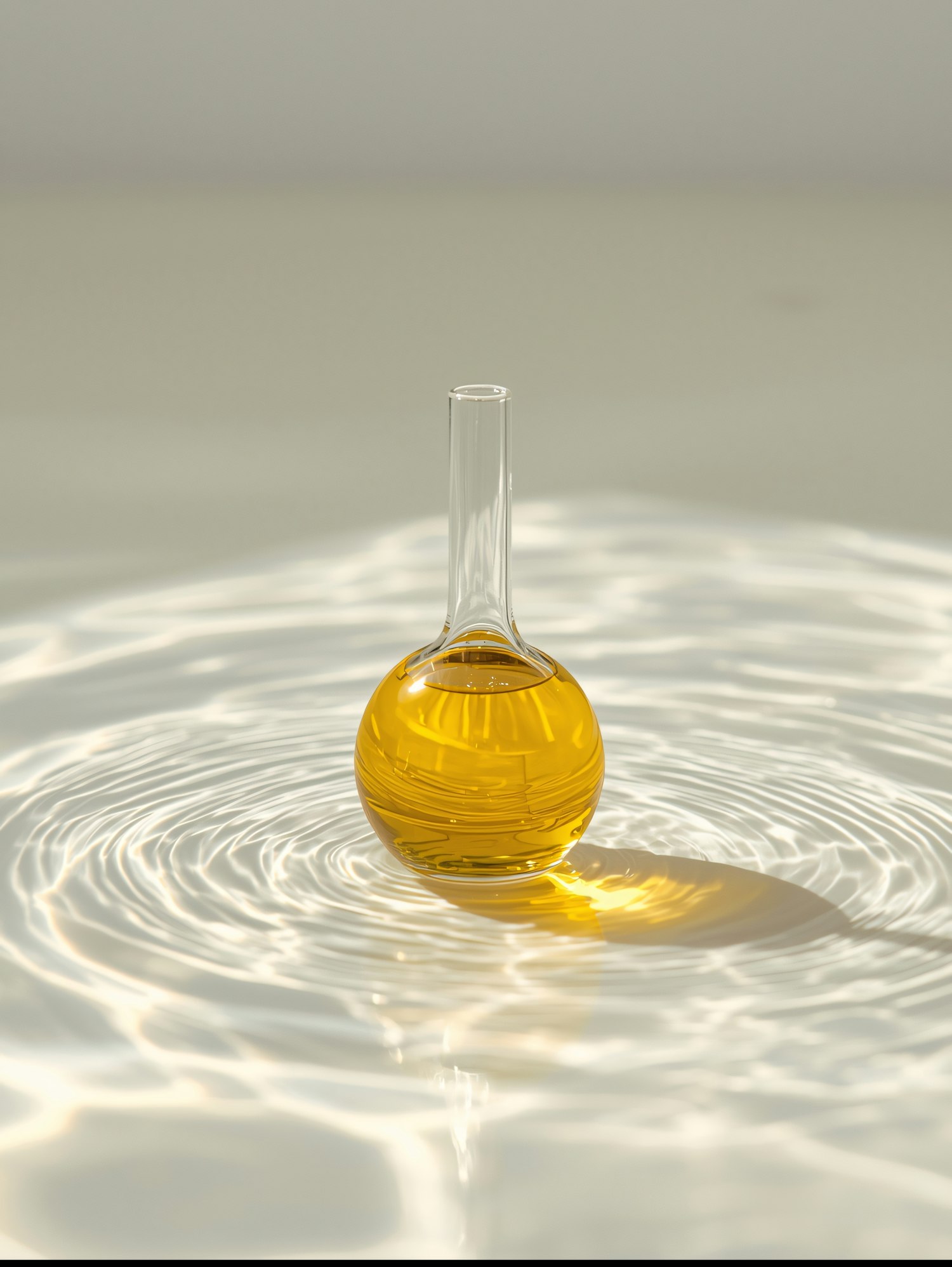 A round-bottom flask with golden liquid on a reflective surface, creating mesmerizing light ripples in a minimalistic setting.