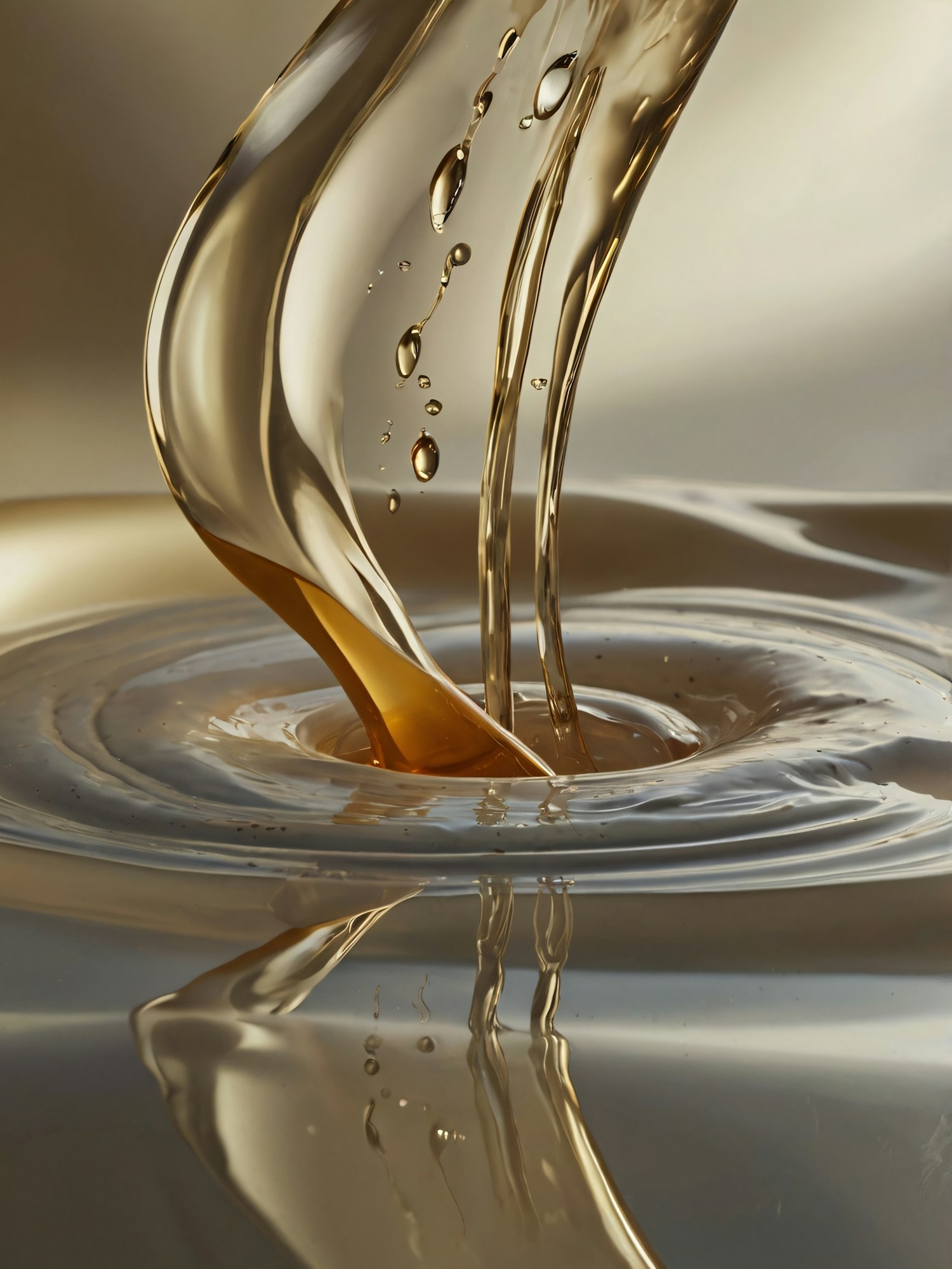 Golden liquid pouring into a pool, creating elegant curves and ripples with a glossy, reflective appearance.