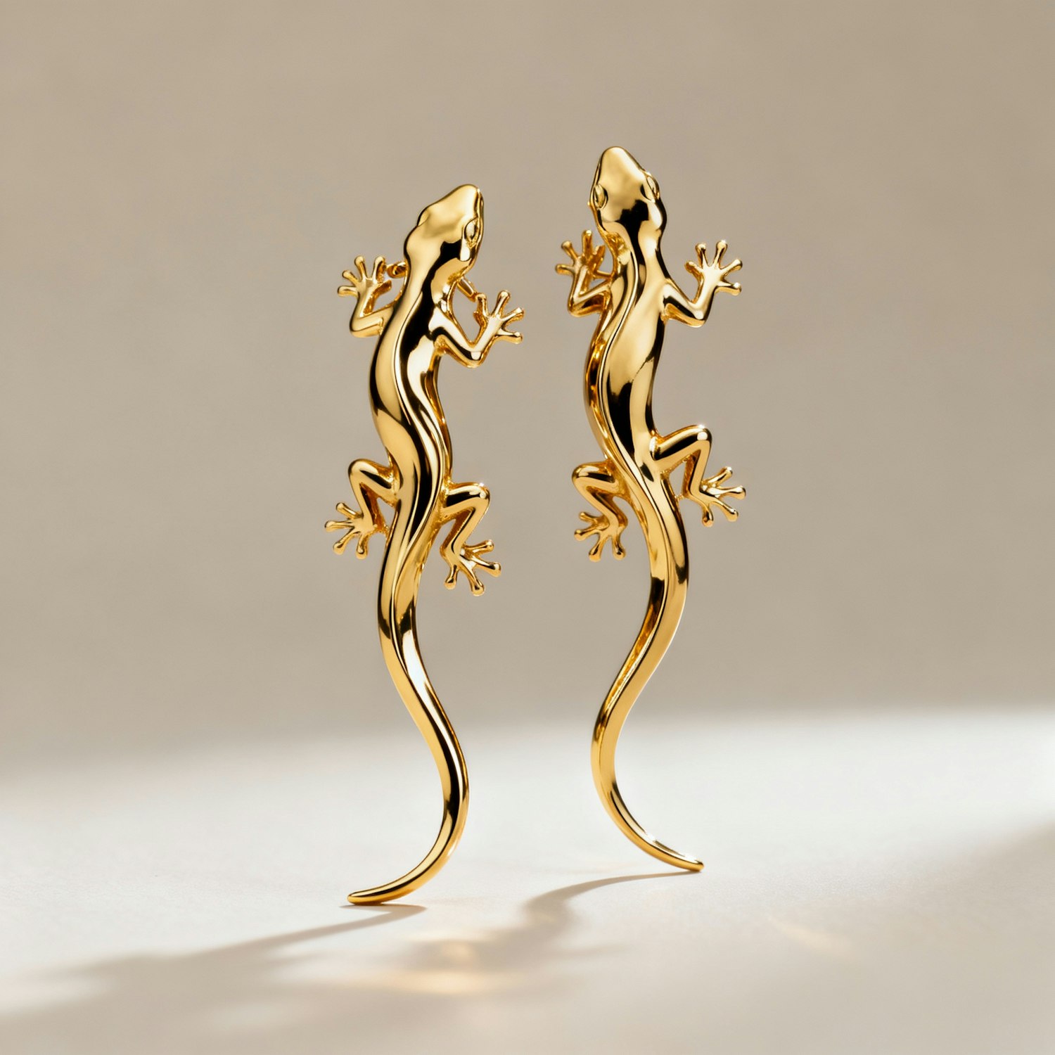 Ultra-realistic product photography of bold statement earrings inspired by lizards. Designed in polished 18k gold, the earrings are sculptural and artistic with elongated, flowing silhouettes and intricate yet refined detailing. The design blends organic reptilian curves with high-fashion jewelry elegance, creating a dramatic but wearable luxury piece. Emphasize brilliance, weight, and craftsmanship — the earrings should look powerful, sophisticated, and couture. Display them against a clean neutral background with soft gradient lighting, highlighting reflection, texture, and bold form. Fine jewelry editorial photography, museum-quality aesthetics
