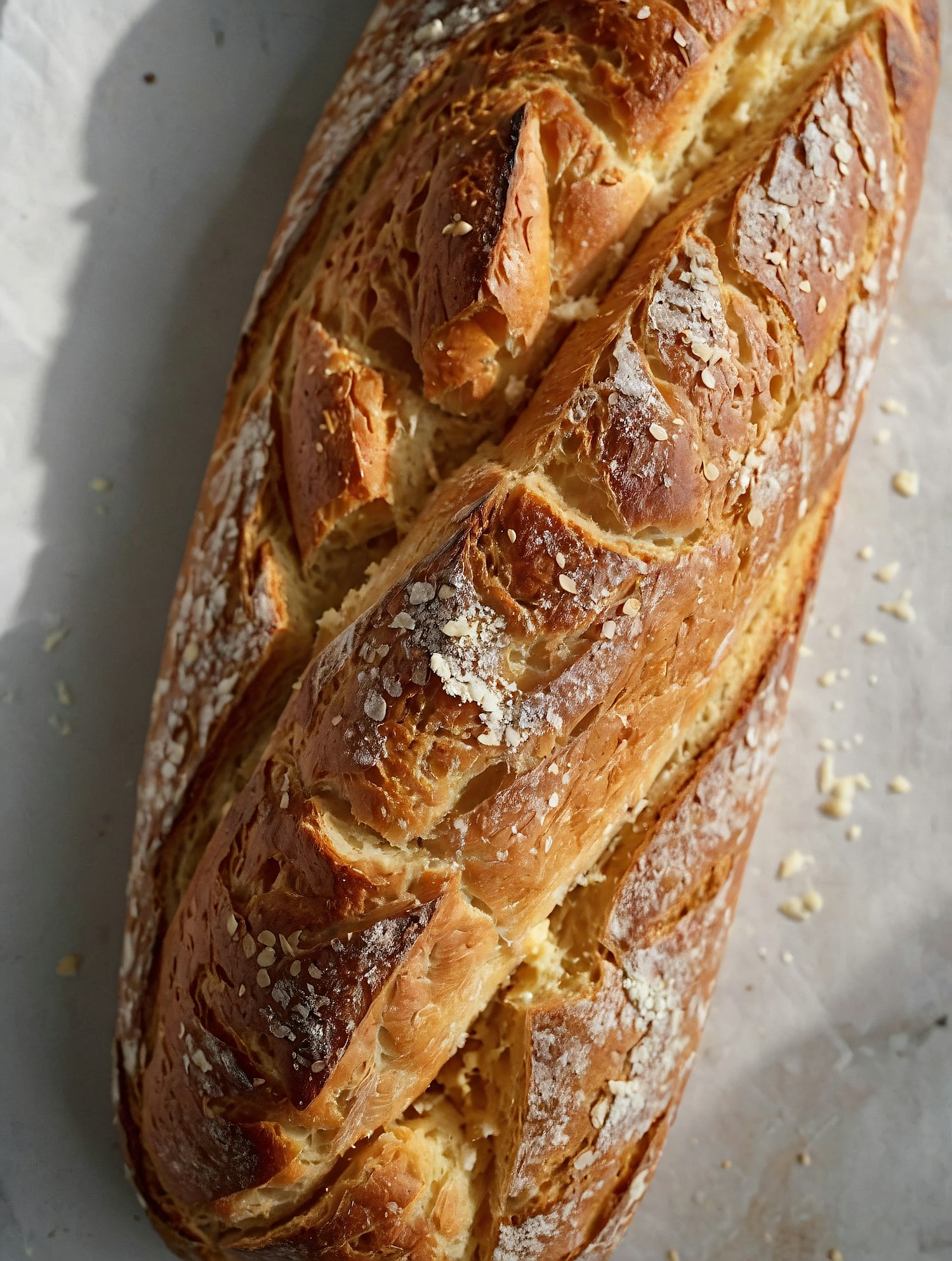 Golden-brown loaf of bread with a crisp crust, sesame seeds, and flour dusting, showcasing its soft, airy interior.