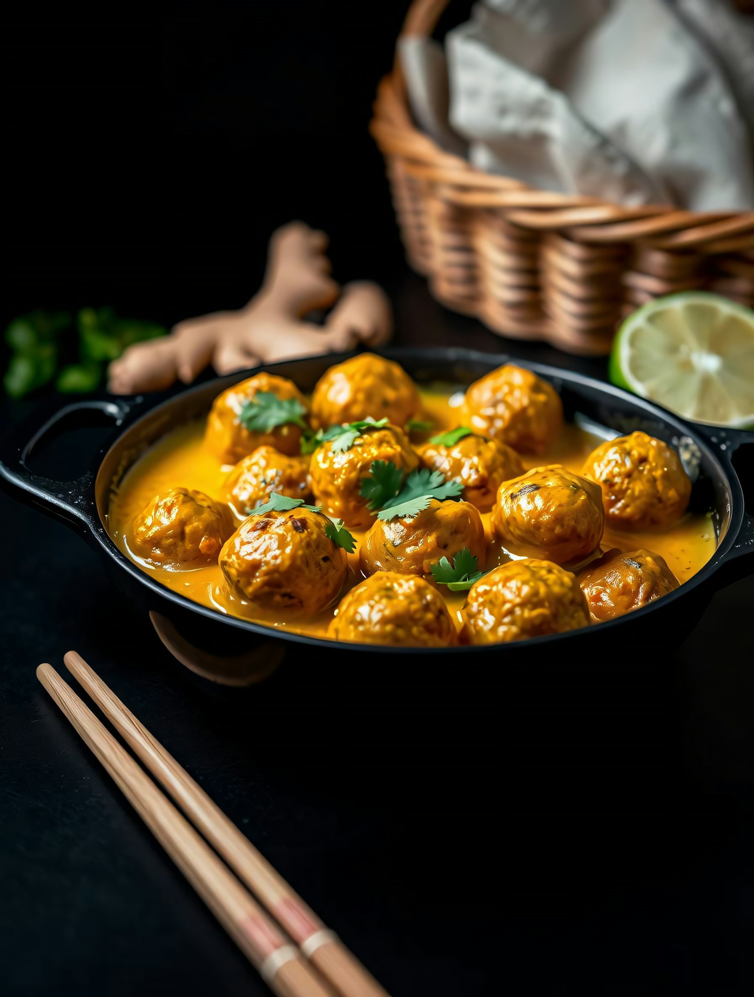 Delicious meatballs in creamy yellow curry sauce, garnished with cilantro. Served with chopsticks, lime, and a wicker basket of napkins.