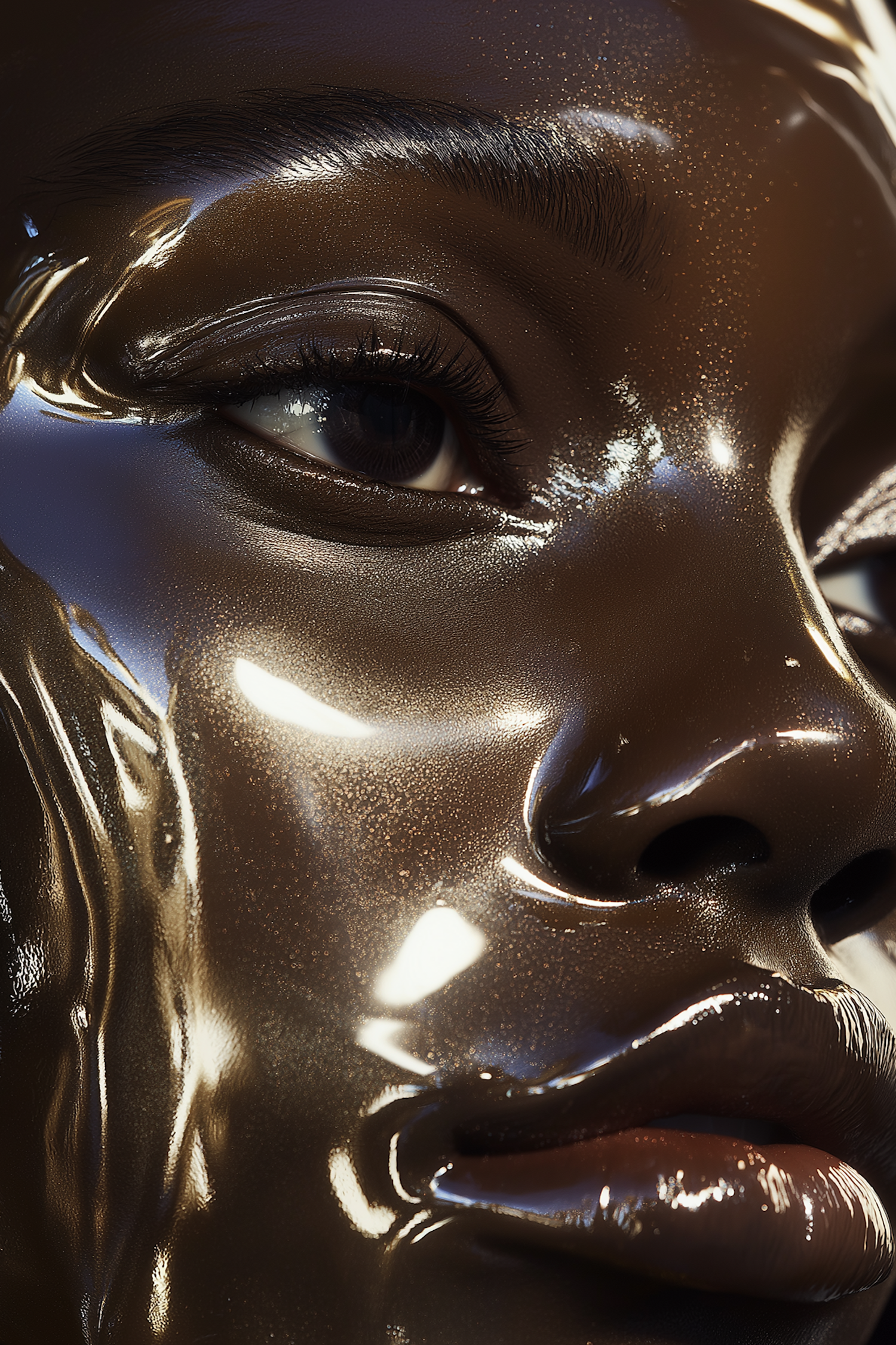 Close-up of a face with metallic gold-coated skin, highlighting glossy textures, detailed pores, and reflective lighting for a dramatic effect.