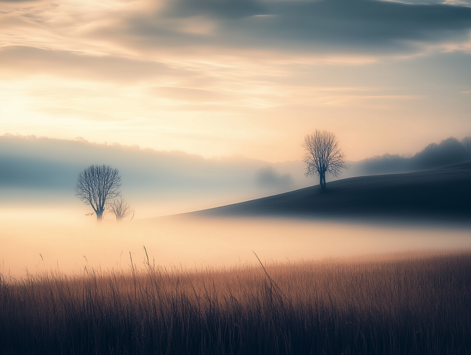 Dreamy misty landscape with golden light, leafless trees, and rolling hills. Perfect for nature lovers and serene scenery enthusiasts.