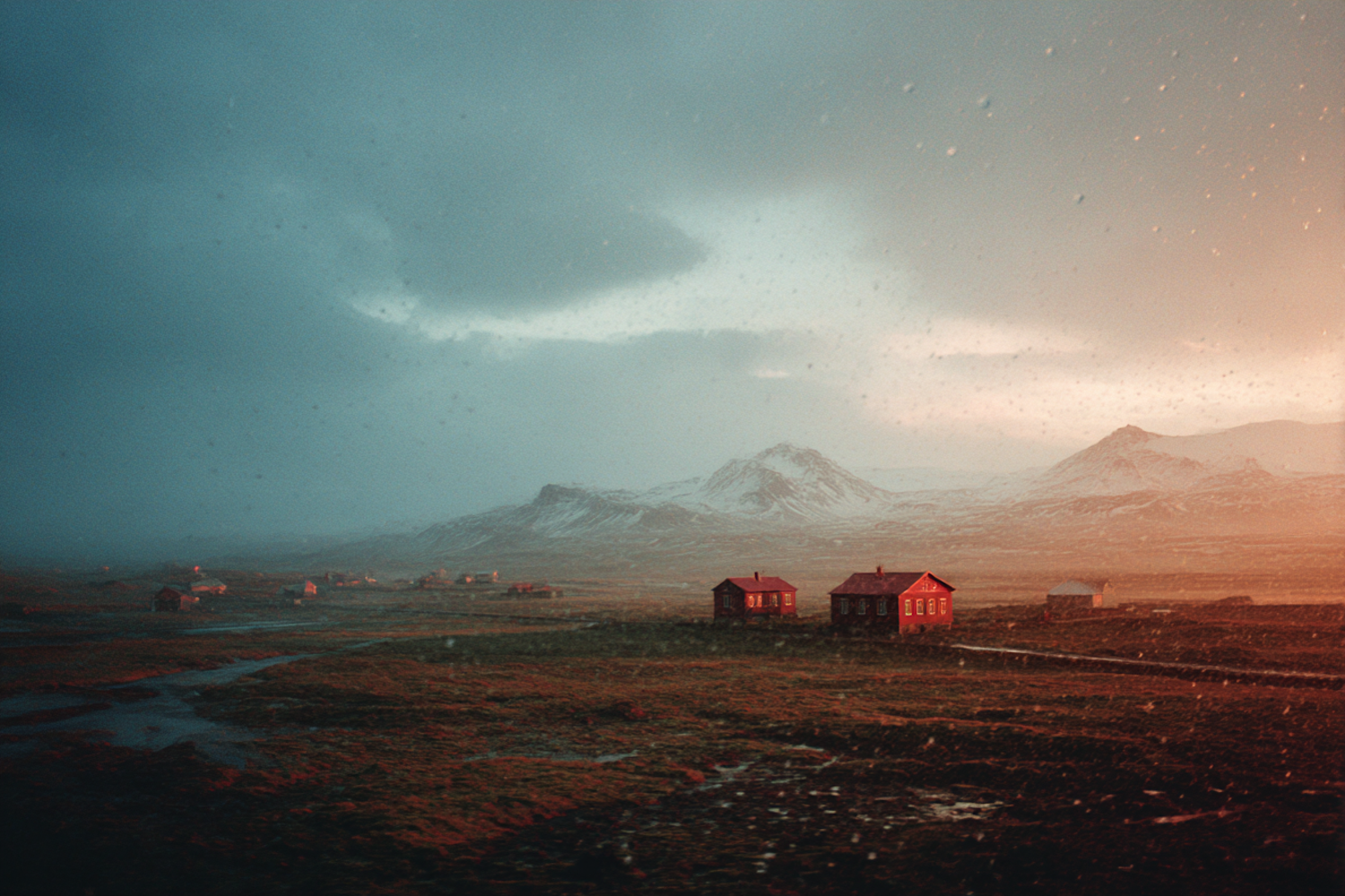 A tranquil scene of red houses on a plain with snow-capped mountains and a dramatic sky, bathed in warm golden light.