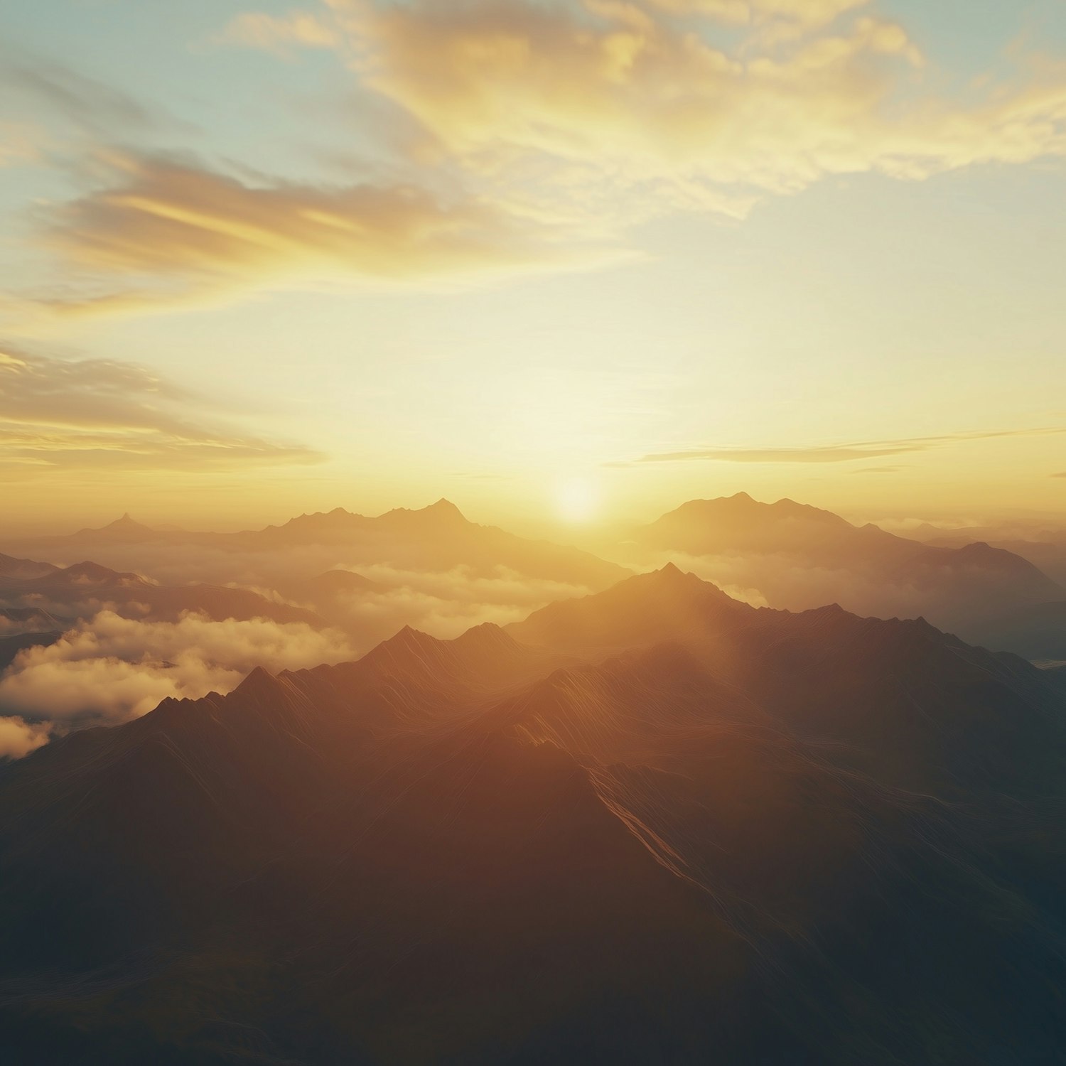 Golden sunrise over rugged mountains with soft clouds and a tranquil sky, creating a serene and breathtaking natural scene.