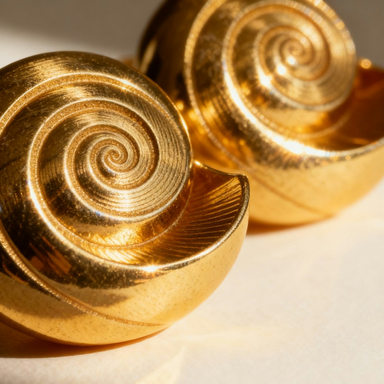 Close-up of two golden nautilus shell-shaped objects with intricate spiral patterns, reflecting light beautifully against a soft background.