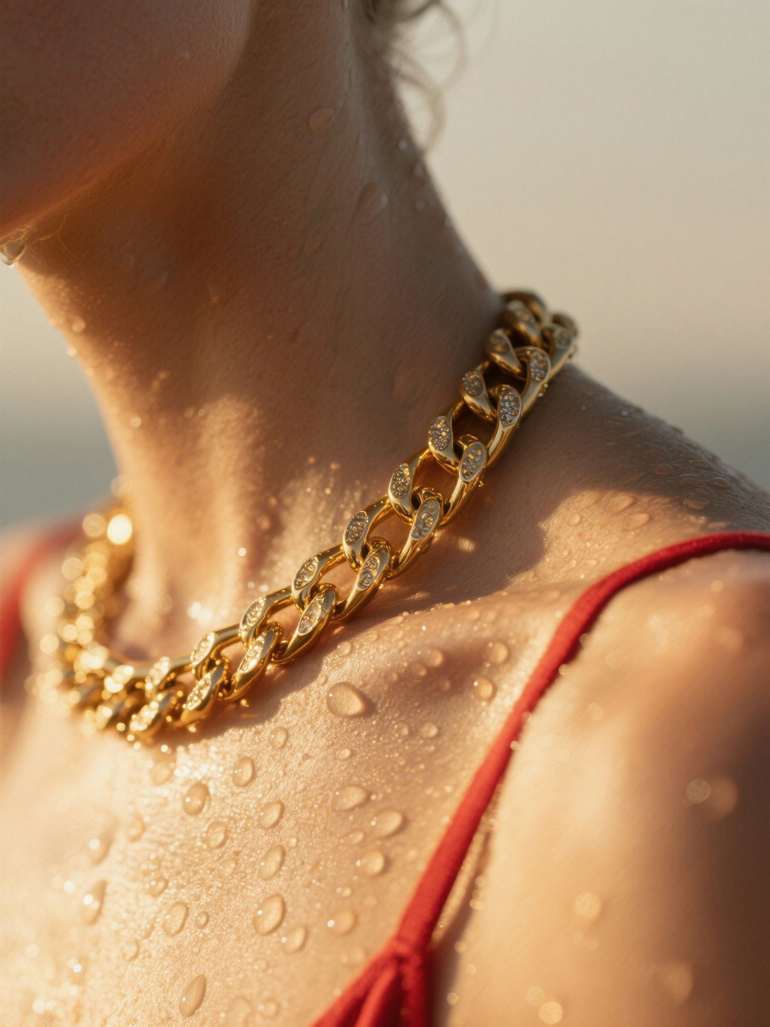 Editorial close-up detail at golden hour, focus on the curve of a shoulder and neck adorned with a bold golden chain necklace. Sunlit droplets of water glisten on the skin, creating natural highlights and textures. Jewelry catches warm golden reflections, contrasting with the sun-kissed skin and the hint of a red fabric strap. Composition is intimate, refined, and minimal, emphasizing the tactile beauty of jewelry and light. Style: high-end fashion editorial photography, warm golden tones, soft cinematic contrast, realistic skin and water textures, cohesive luxurious summer campaign look