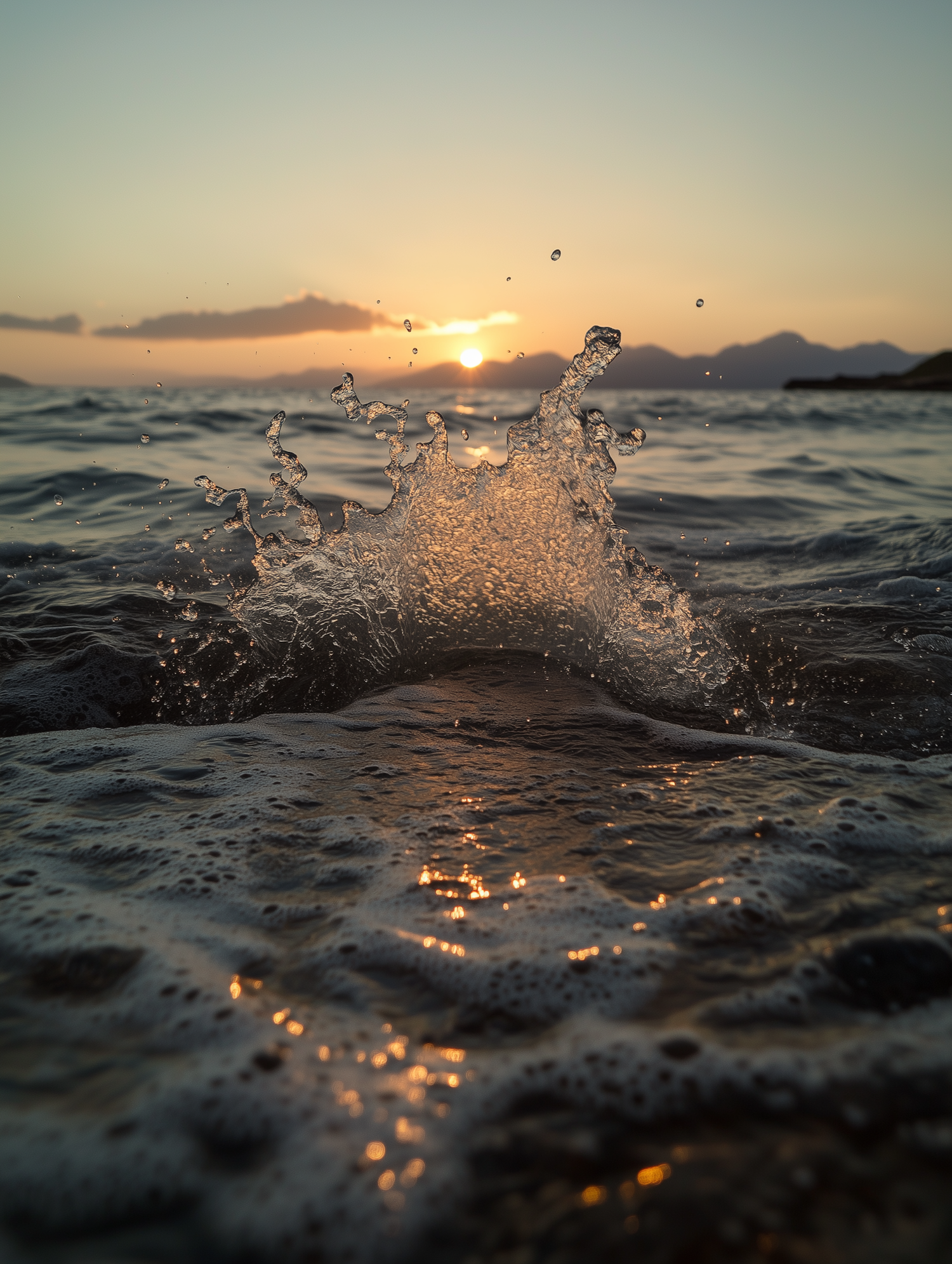 Golden sunset over the ocean with a dramatic water splash in the foreground, rippling waves, and distant mountains in the background.