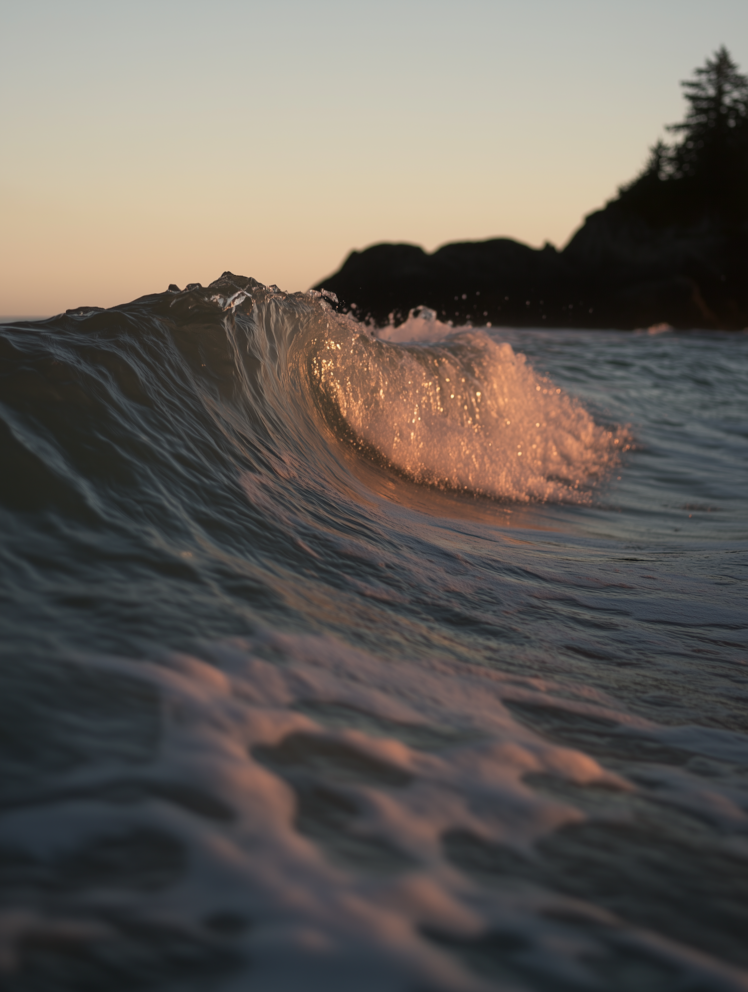 Golden sunset light illuminates a cresting ocean wave with frothy foam, set against a rocky shoreline and tranquil evening sky.