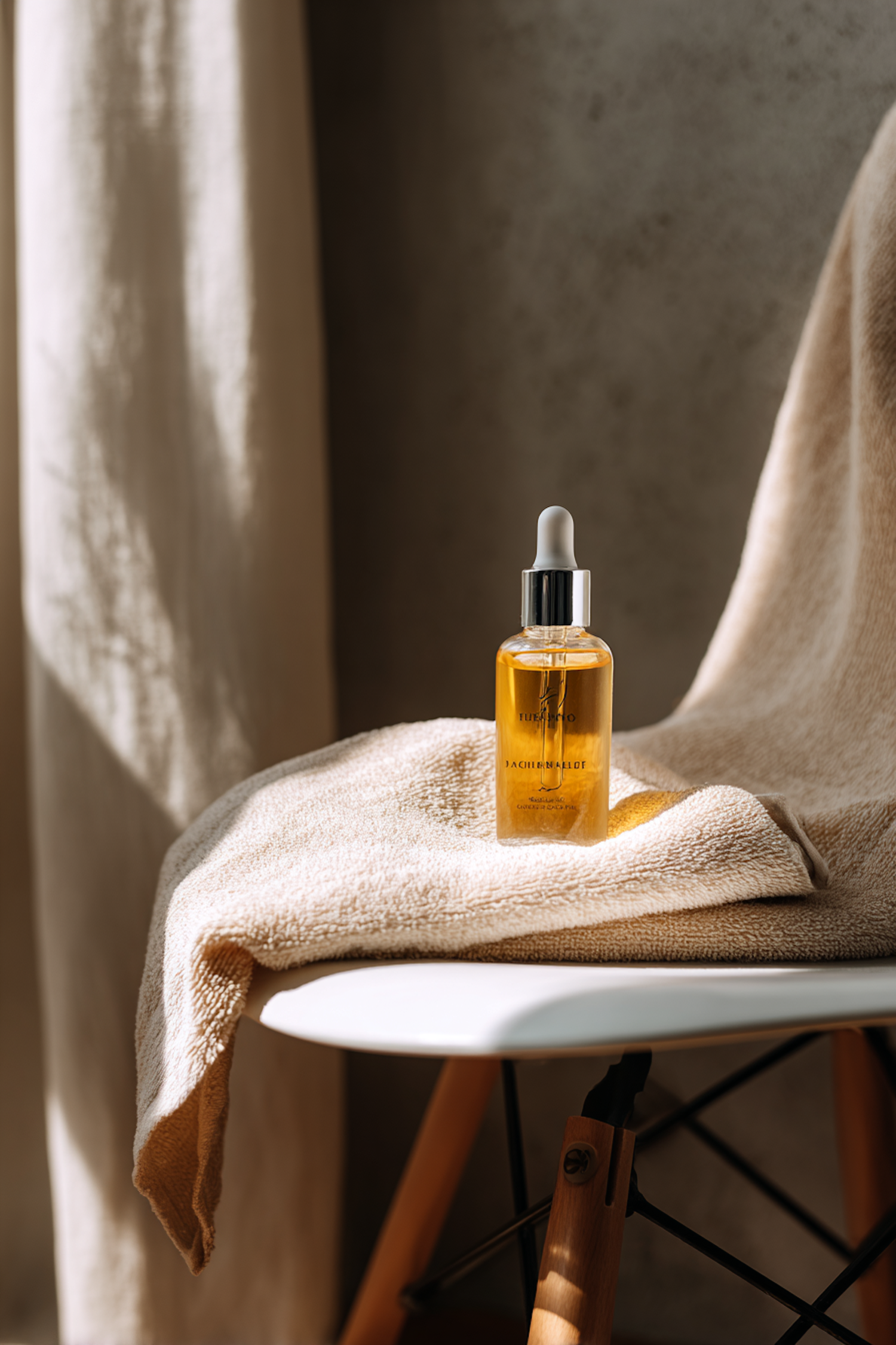 A golden oil bottle with a dropper sits on a beige towel on a white chair, bathed in warm natural light for a cozy, minimalist vibe.