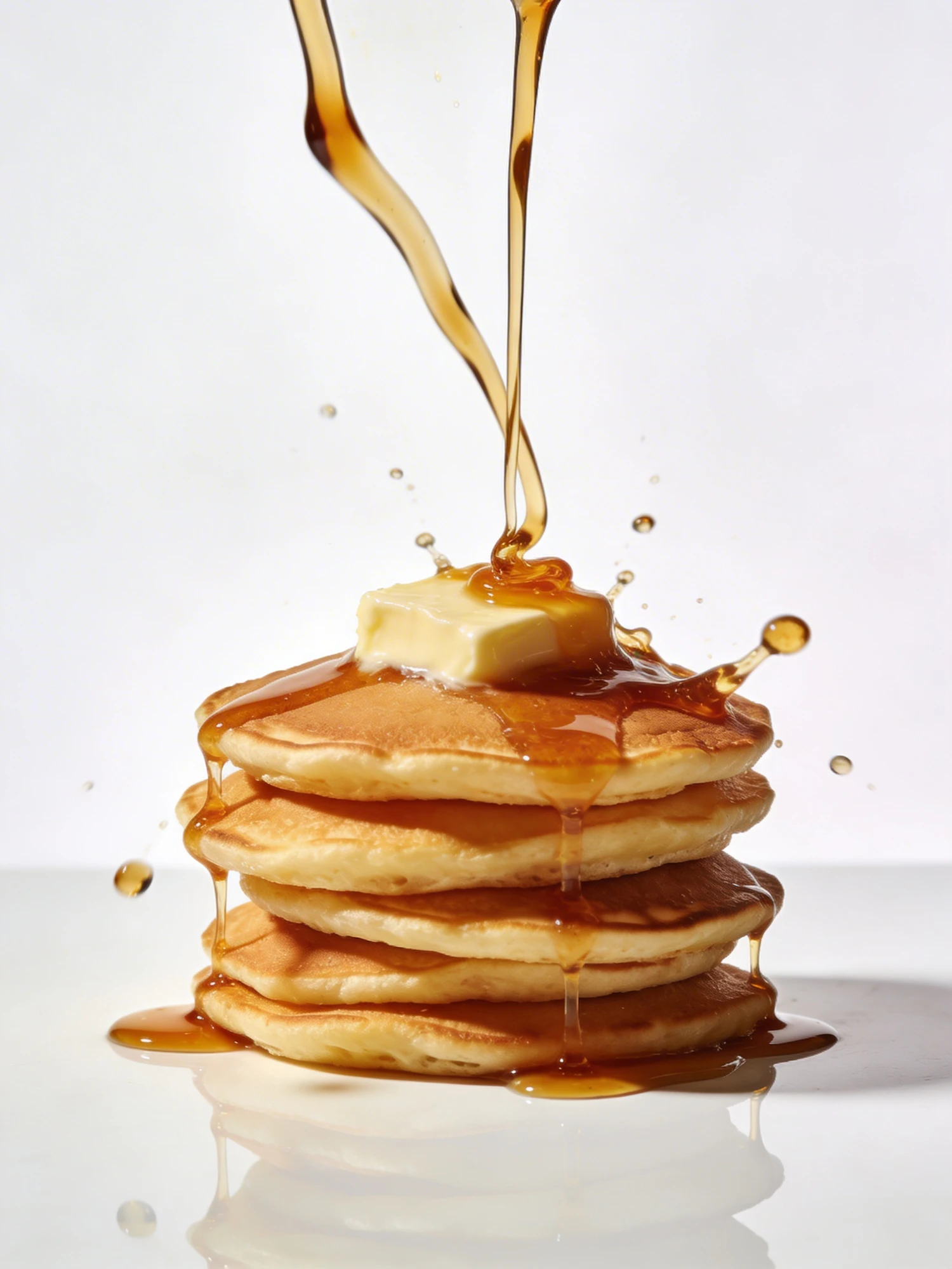 Close up of golden pancakes with butter and syrup on clean white reflective surface, messy and uneven syrup pouring but captured mid-motion with slight blur flash making syrup look overly shiny. captured mid-motion with slight blur flash making syrup look overly shiny studio lighting background white background + master prompt
