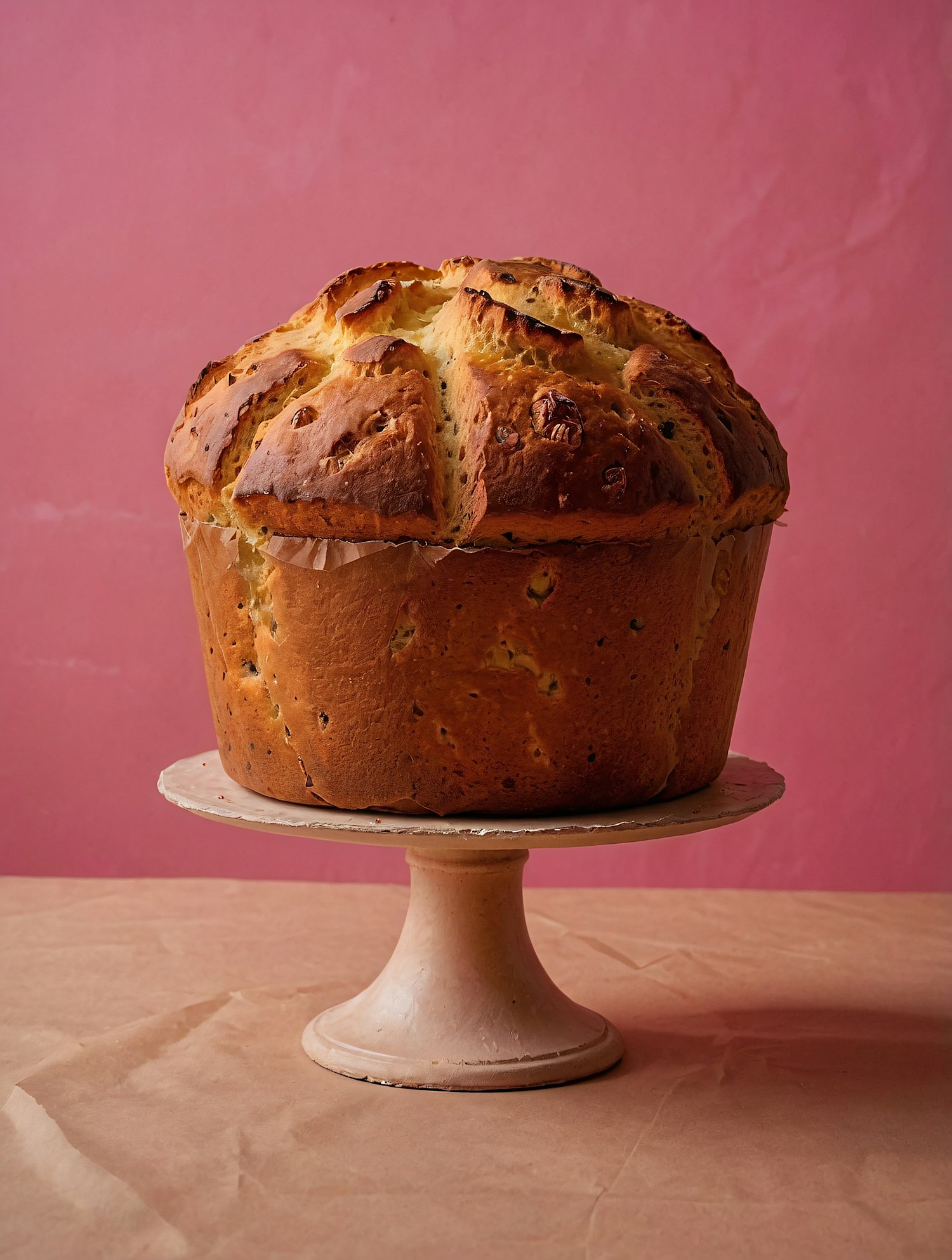 Golden-brown panettone on a rustic cake stand with a pink background, showcasing its fluffy texture and dried fruit details.