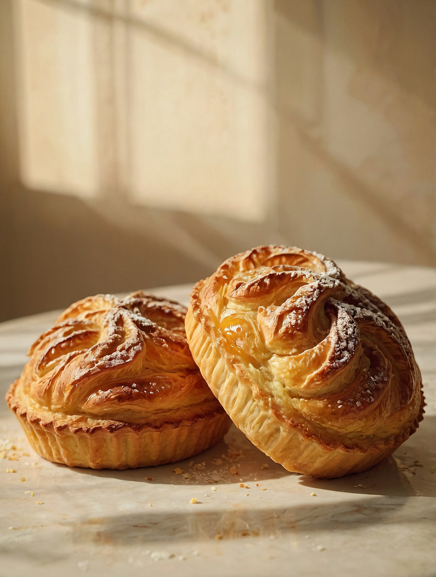 Golden, flaky pastries with swirled tops and powdered sugar on a marble surface, bathed in warm natural light.