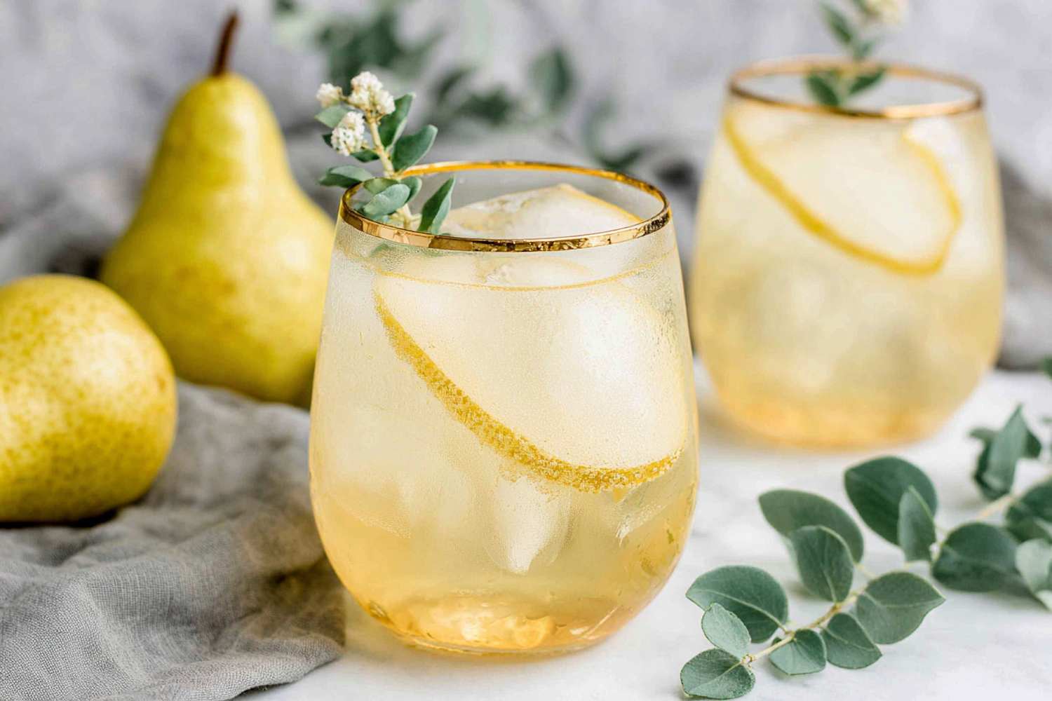 Refreshing pear cocktails in gold-rimmed glasses, garnished with greenery and surrounded by fresh pears and leaves.
