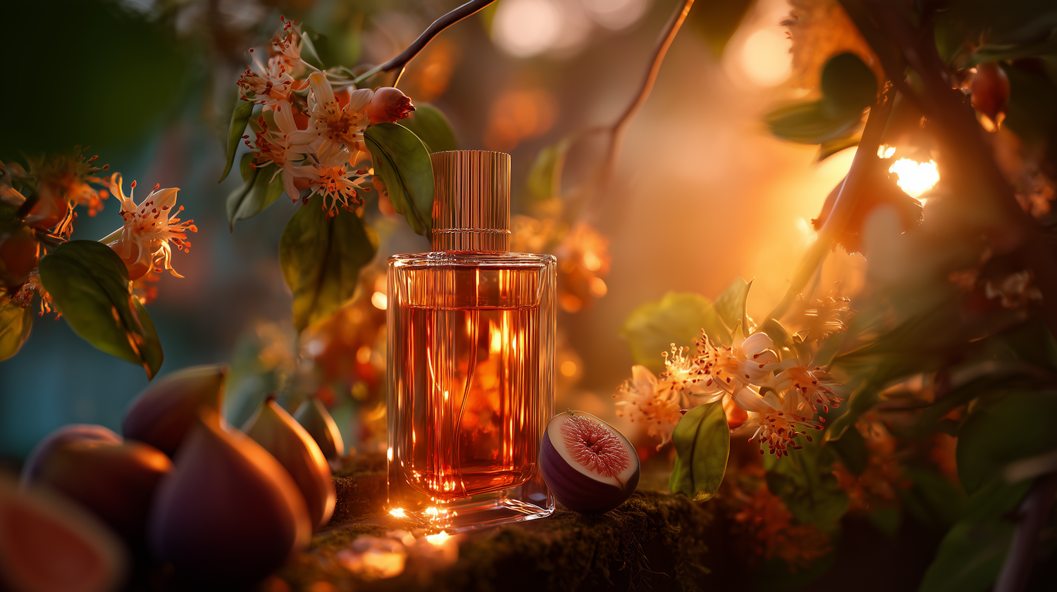 A golden perfume bottle surrounded by figs and orange blossoms, glowing in warm sunlight for a dreamy, nature-inspired aesthetic.