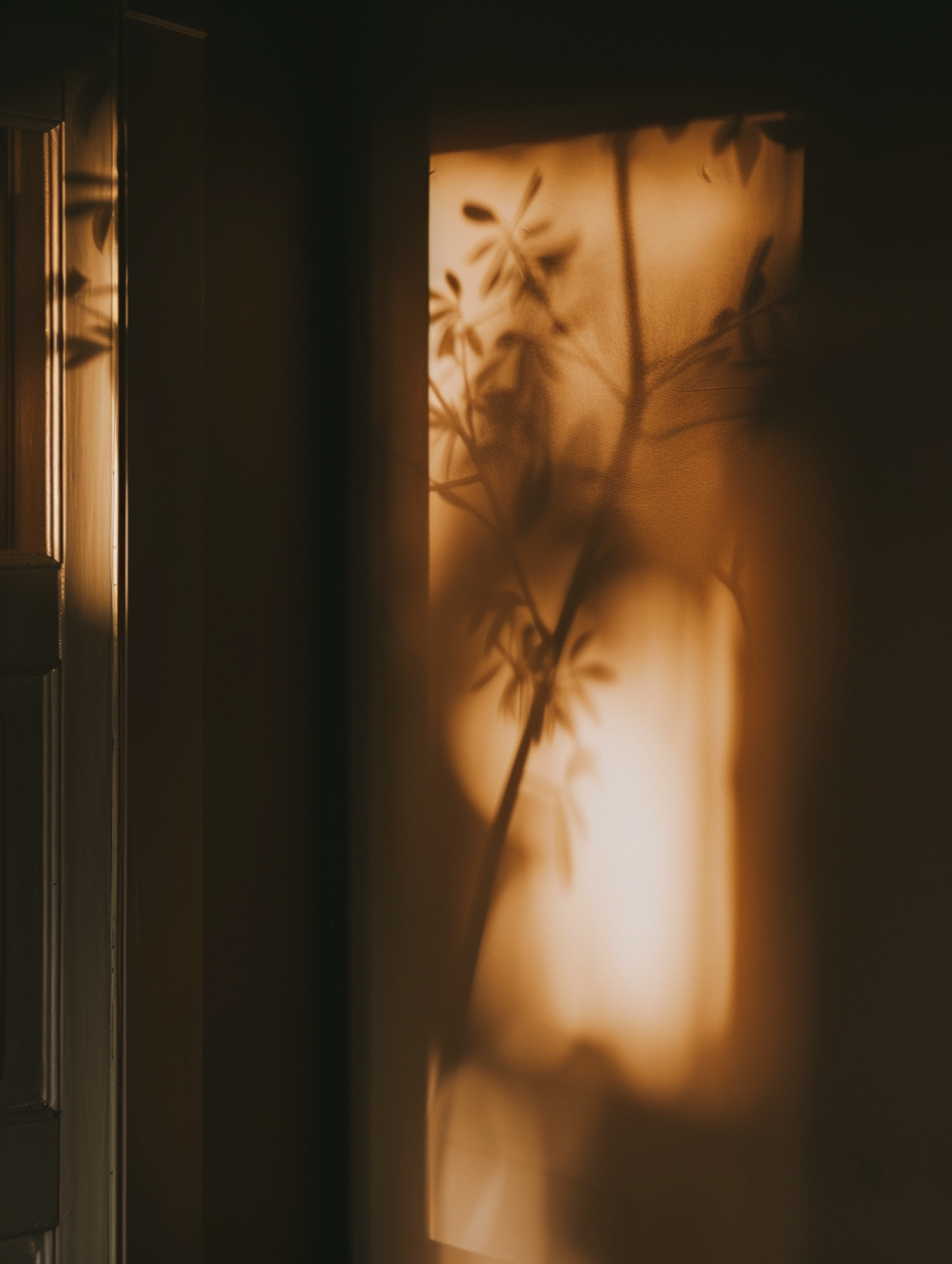 Golden sunlight casts a leafy plant's shadow on a wall, creating a serene, warm ambiance with soft textures and organic shapes.