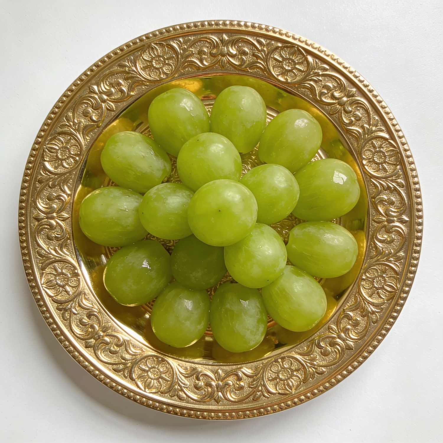 A golden ornate plate holds a symmetrical arrangement of fresh green grapes, creating a visually striking and elegant presentation.