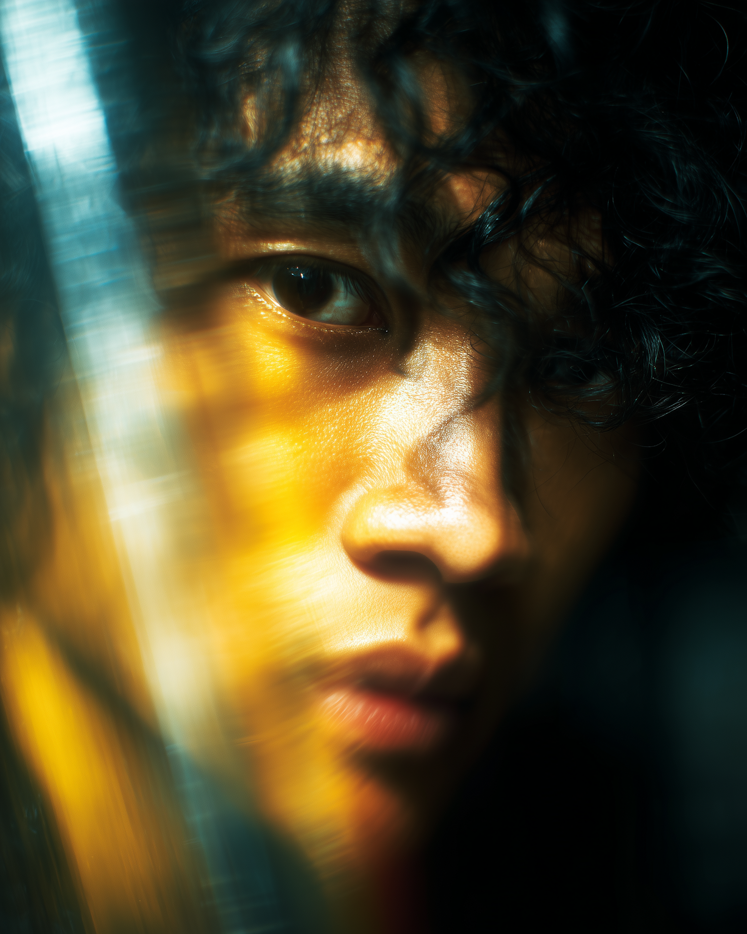 Dramatic close-up portrait with warm lighting, a blurry aesthetic, and intense focus on the subject's face, emphasizing vibrant, moody tones.