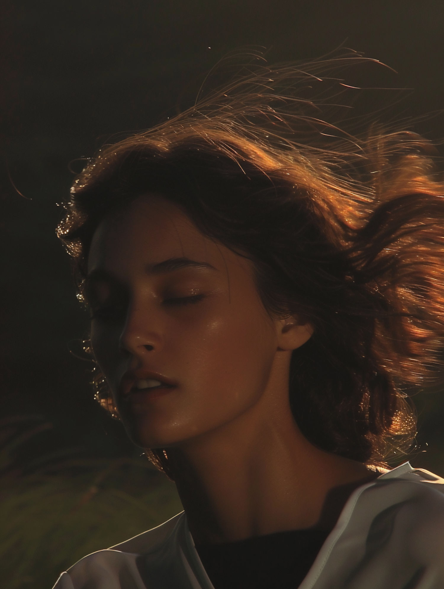 Close-up of a woman with tousled hair in golden light, eyes closed, exuding serenity. Warm tones and soft glow highlight her features.