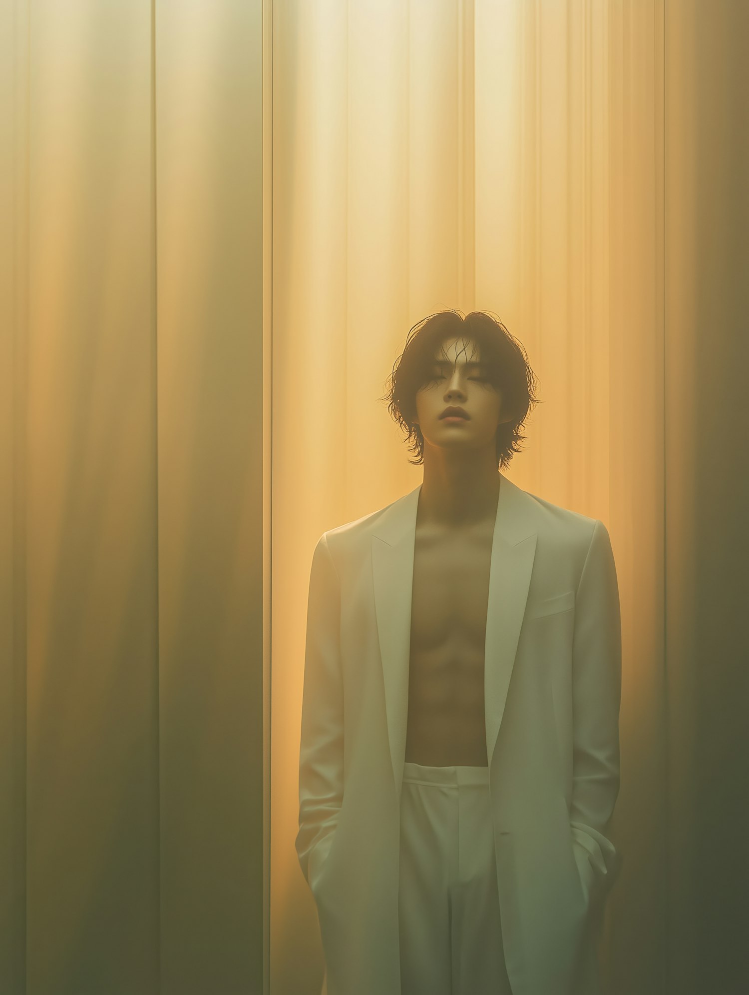 A young man in a white suit stands in golden light, exuding elegance with his shirtless look and serene expression. Warm, ethereal vibes.