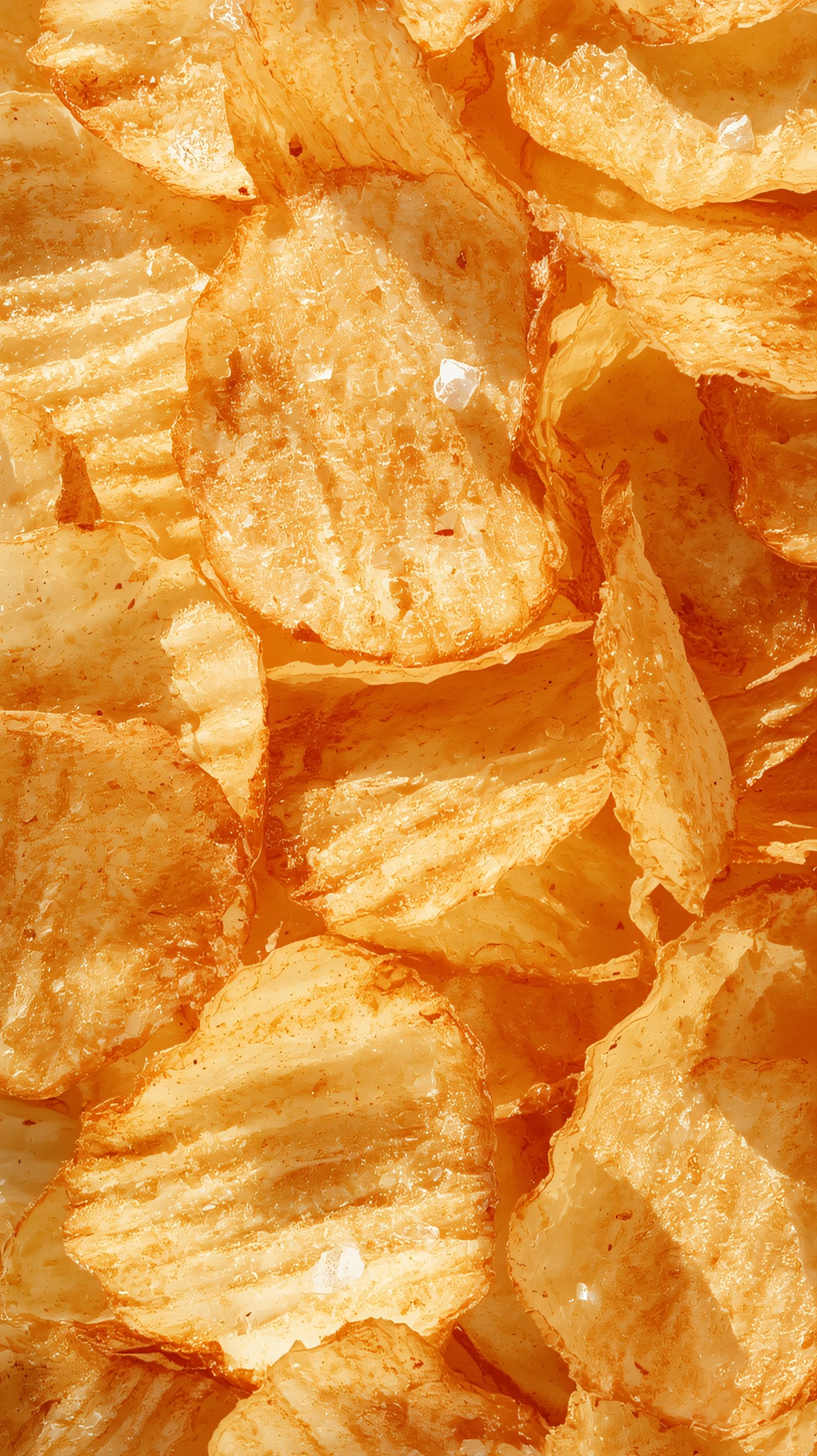Close-up of golden, crispy ridged potato chips with visible seasoning and salt crystals, showcasing their crunchy texture.