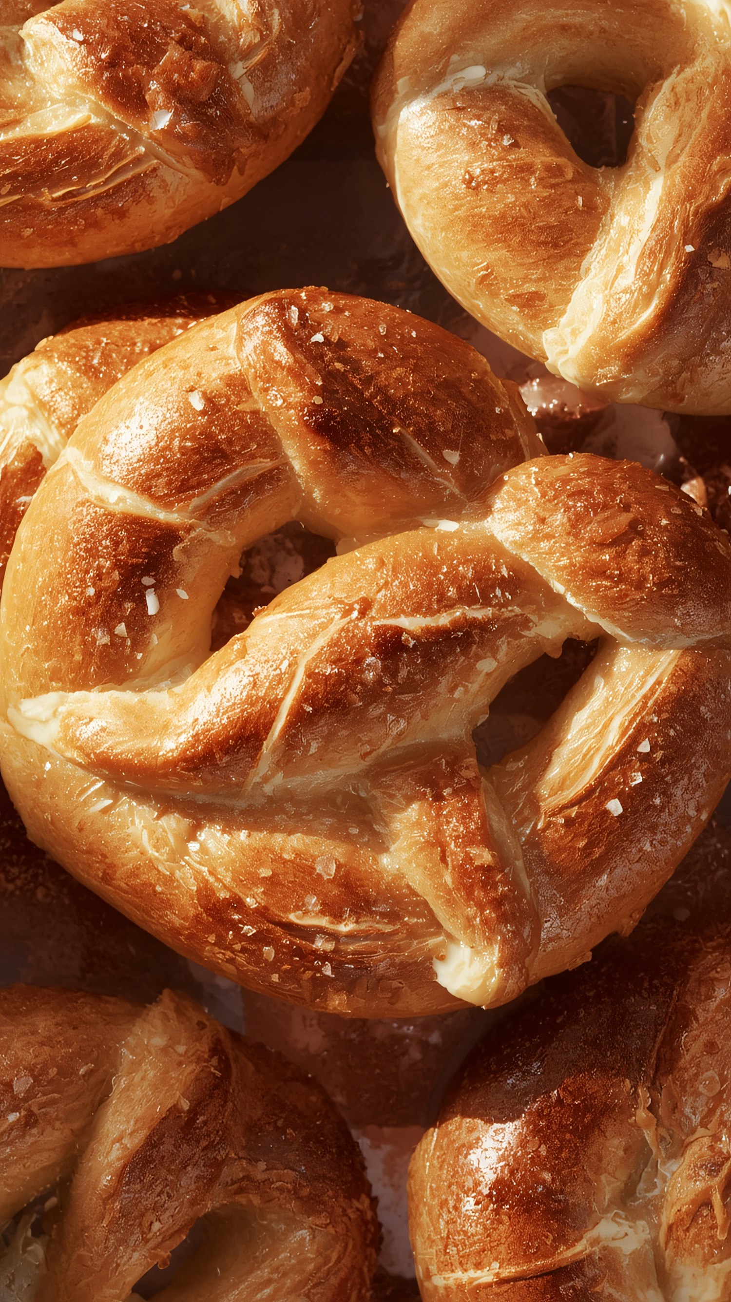 Golden-brown pretzels with a glossy finish and coarse salt, showcasing their traditional twisted shape and freshly baked texture.