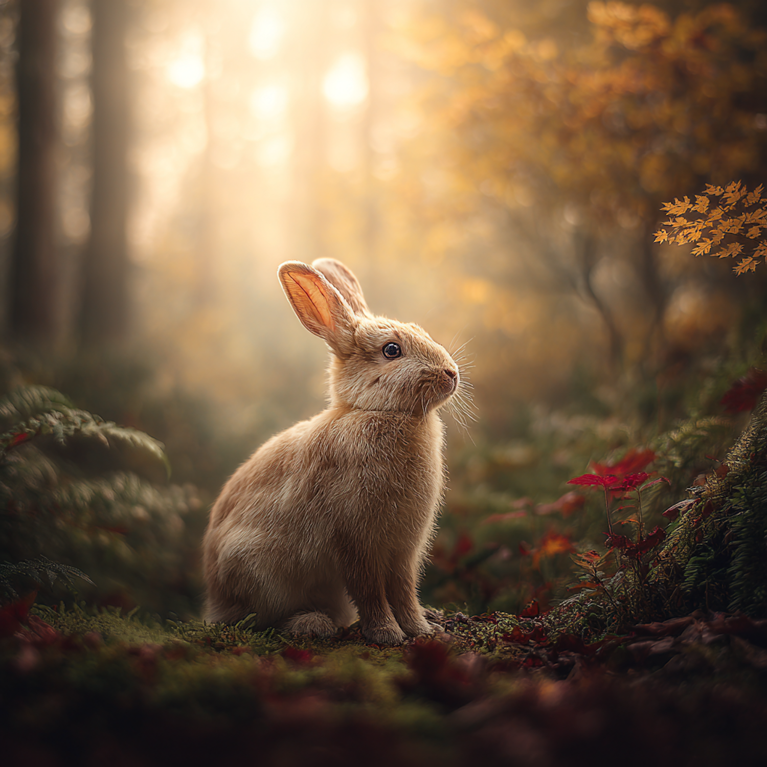 A golden-furred rabbit sits on a mossy forest floor, surrounded by autumn leaves and bathed in warm sunlight filtering through the trees.