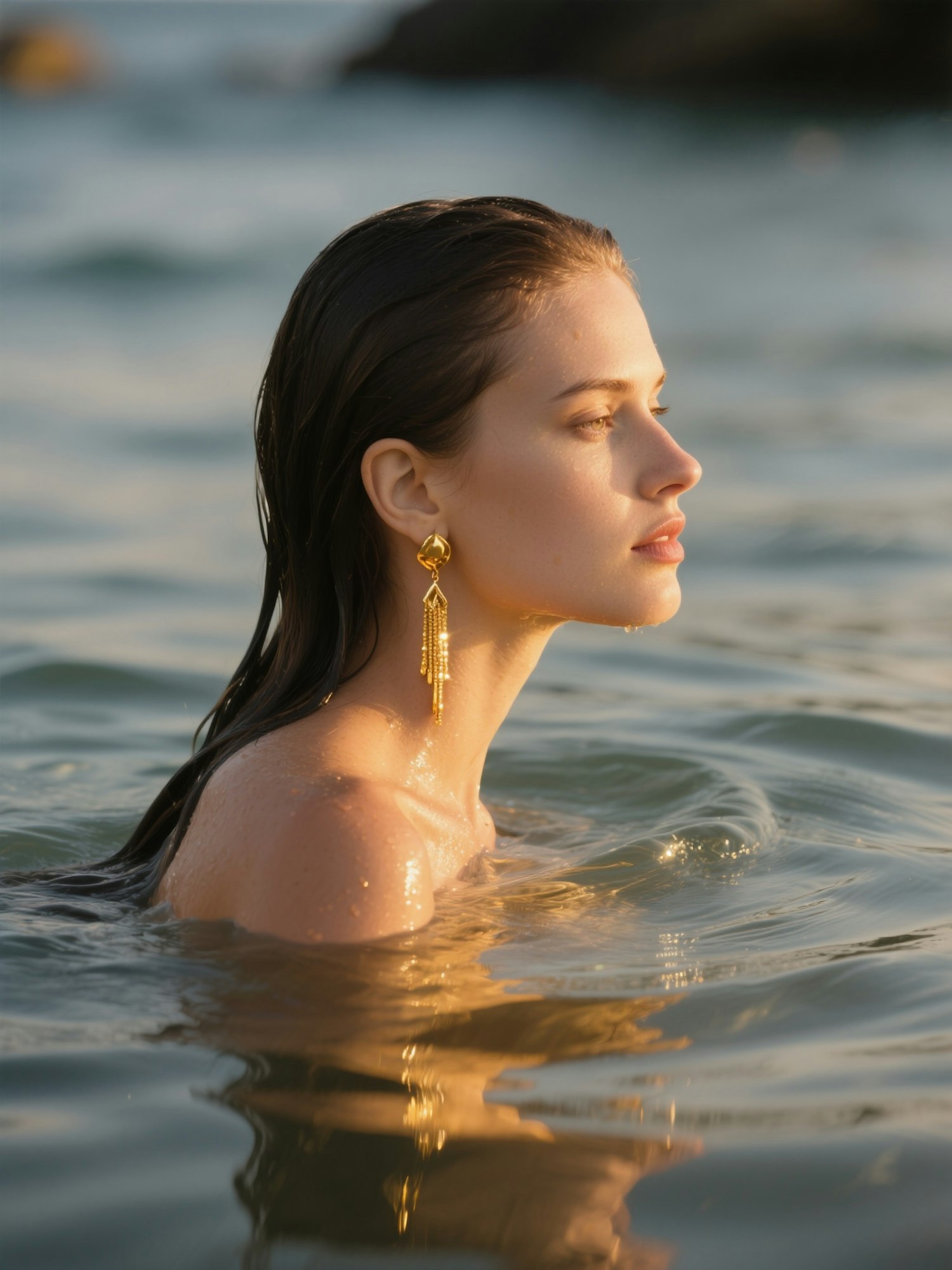 Editorial portrait at golden hour, young woman emerging from calm sea water, profile view with wet hair slicked back. She wears a long dangling golden earring that reflects the warm light, contrasted against her glowing skin and the soft shimmer of the water surface. Her reflection is visible in the gentle ripples, creating a painterly effect. Atmosphere is serene and luxurious, with the focus on the jewelry and natural beauty. Style: high-end fashion editorial photography, warm golden tones, soft cinematic contrast, realistic textures of skin and water, cohesive and refined mood for a luxury summer campaign.