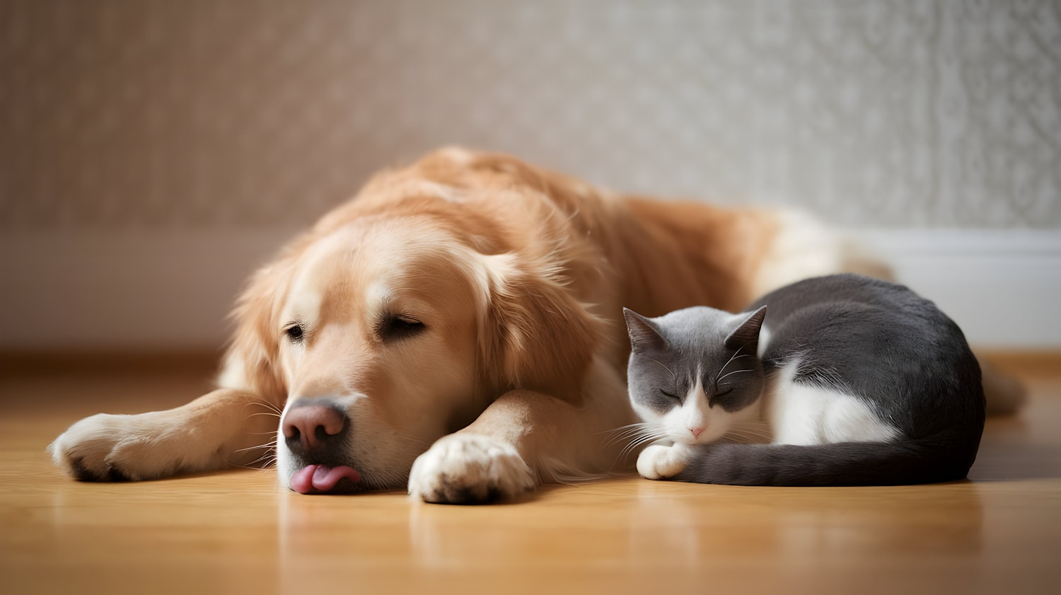 A golden retriever and a gray-and-white cat relax together on a wooden floor, exuding warmth and companionship in a cozy indoor setting.