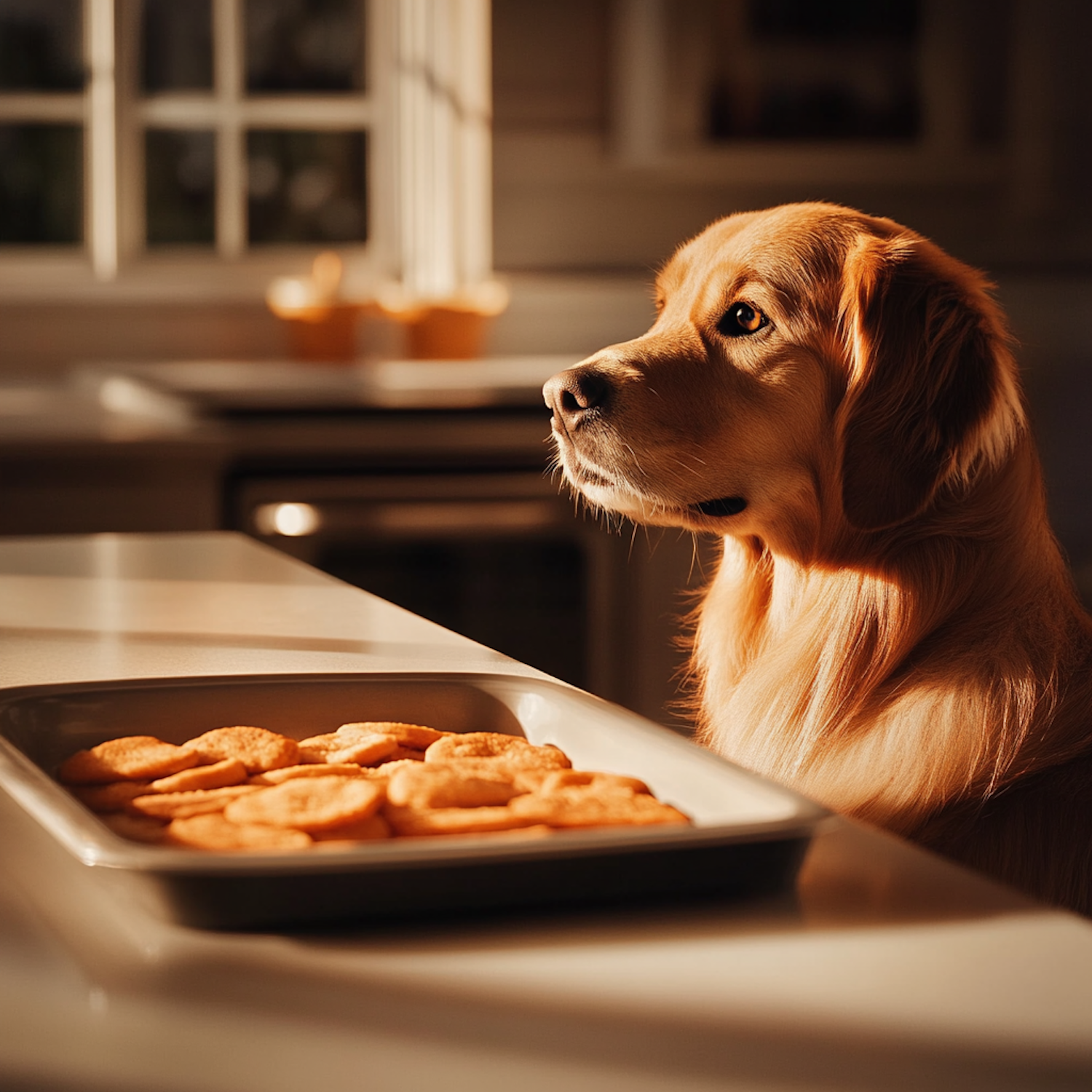 Golden retriever gazes at a tray of cookies in a sunlit kitchen, creating a warm and cozy atmosphere.