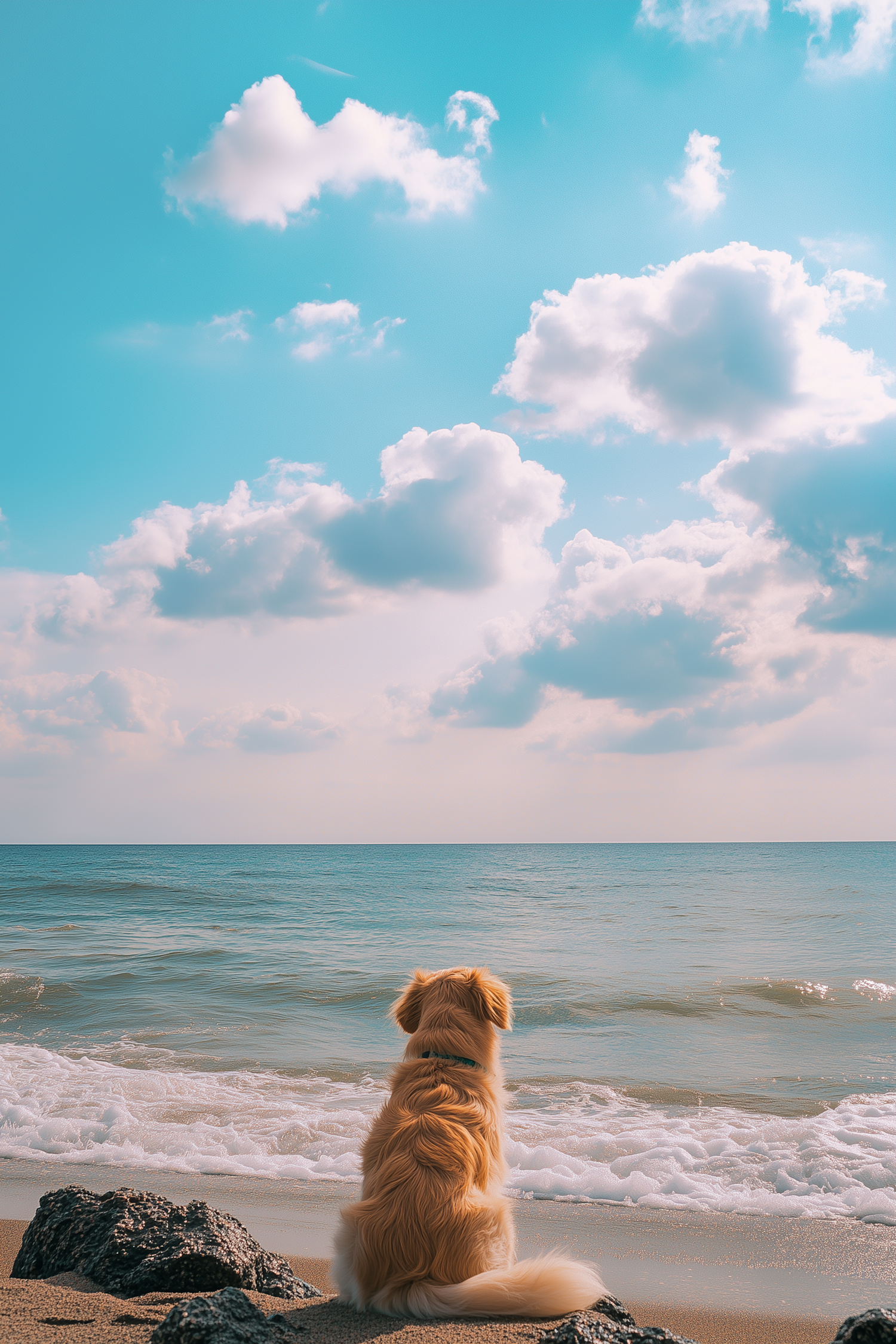 Golden retriever sitting on a sandy beach, gazing at the ocean under a bright blue sky with fluffy white clouds.