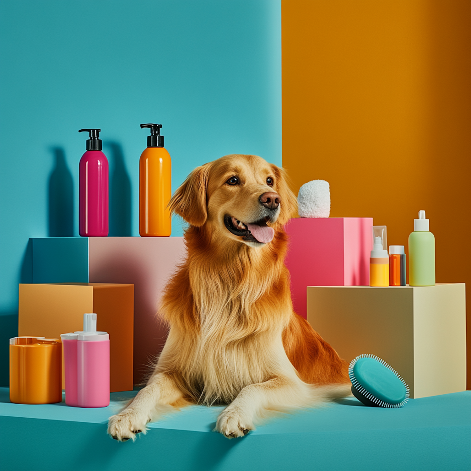 Golden retriever with grooming products in a colorful setting. Bright bottles, a brush, and bold teal and mustard yellow background.