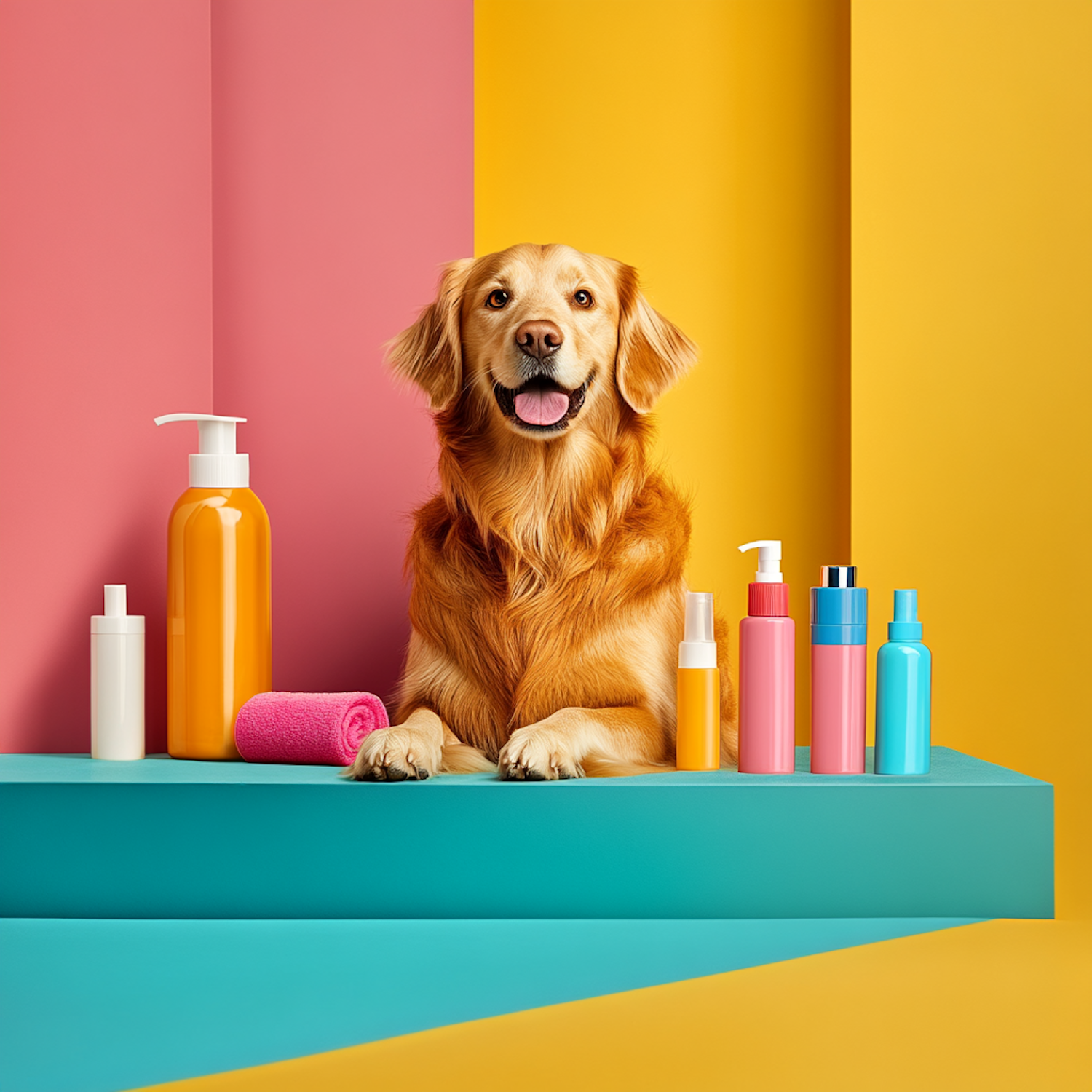 Golden retriever with grooming products on a colorful set. Bright yellow, pink, and teal tones create a playful, modern vibe.