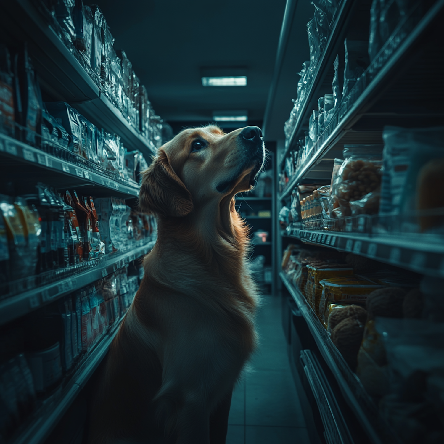 A golden retriever in a dimly lit grocery aisle gazes upward, surrounded by shelves of snacks and food, creating a cinematic vibe.
