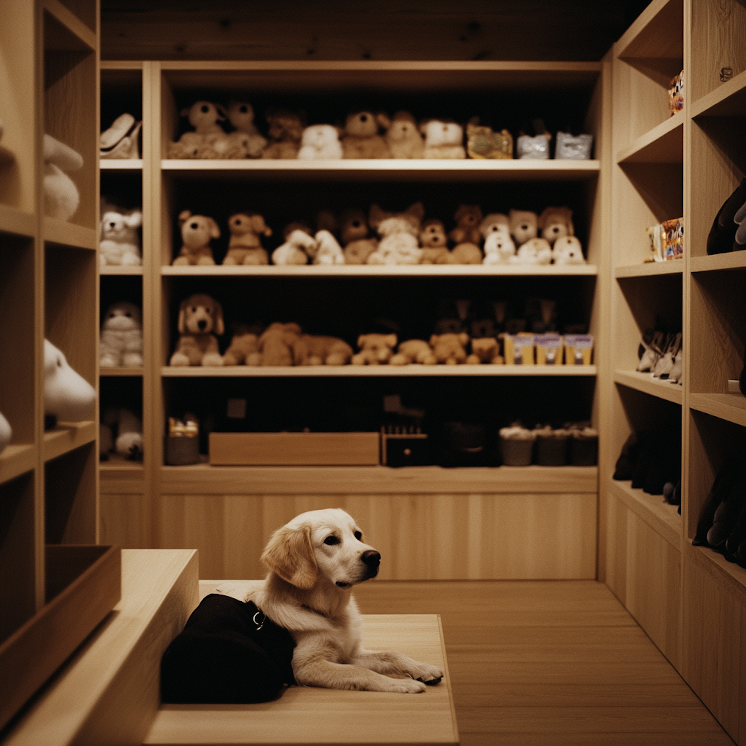 Golden retriever puppy in a cozy room with shelves of plush toys, creating a warm and inviting atmosphere.