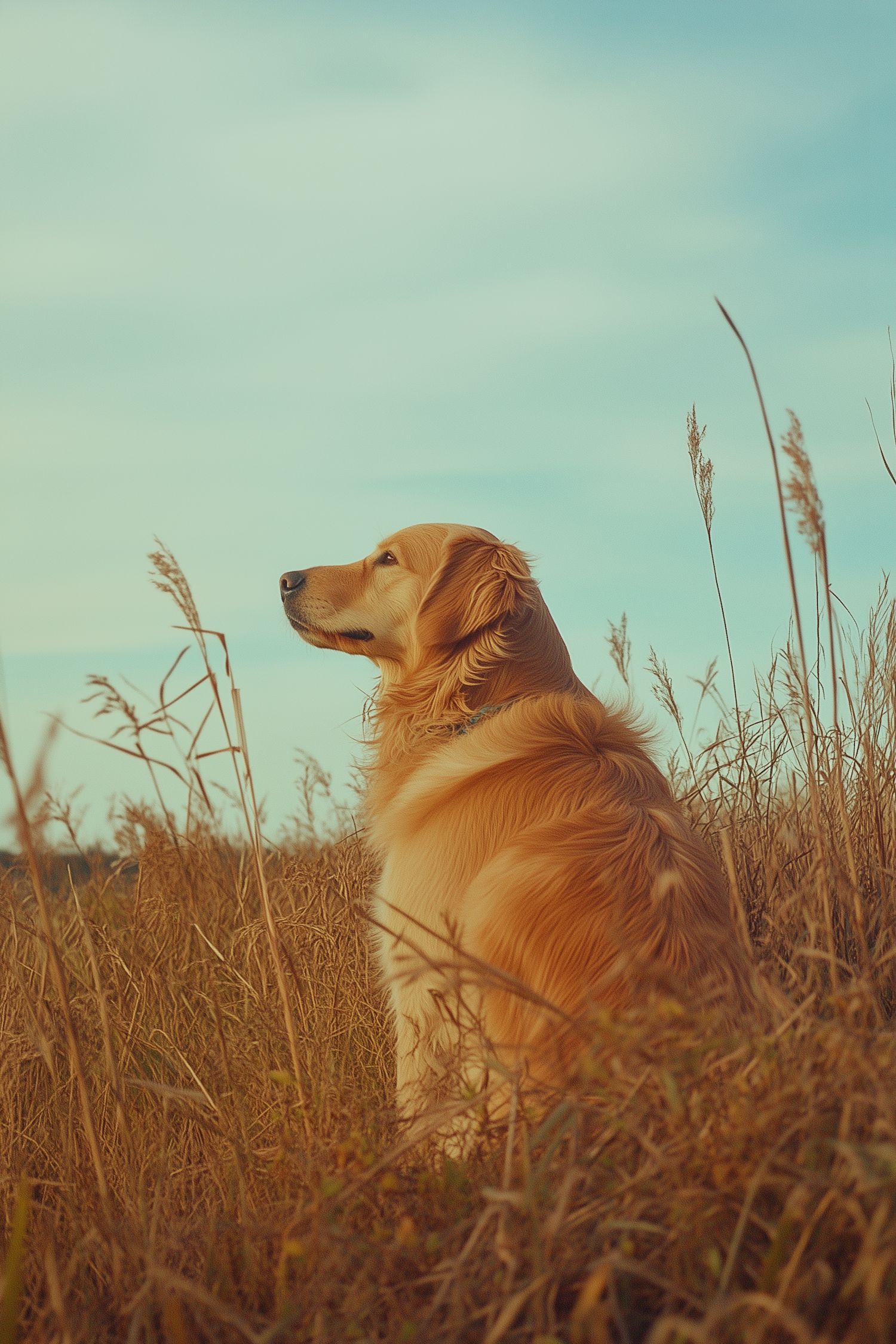 Golden retriever in a field of tall grass, gazing into the distance under a soft blue sky, exuding peace and tranquility.