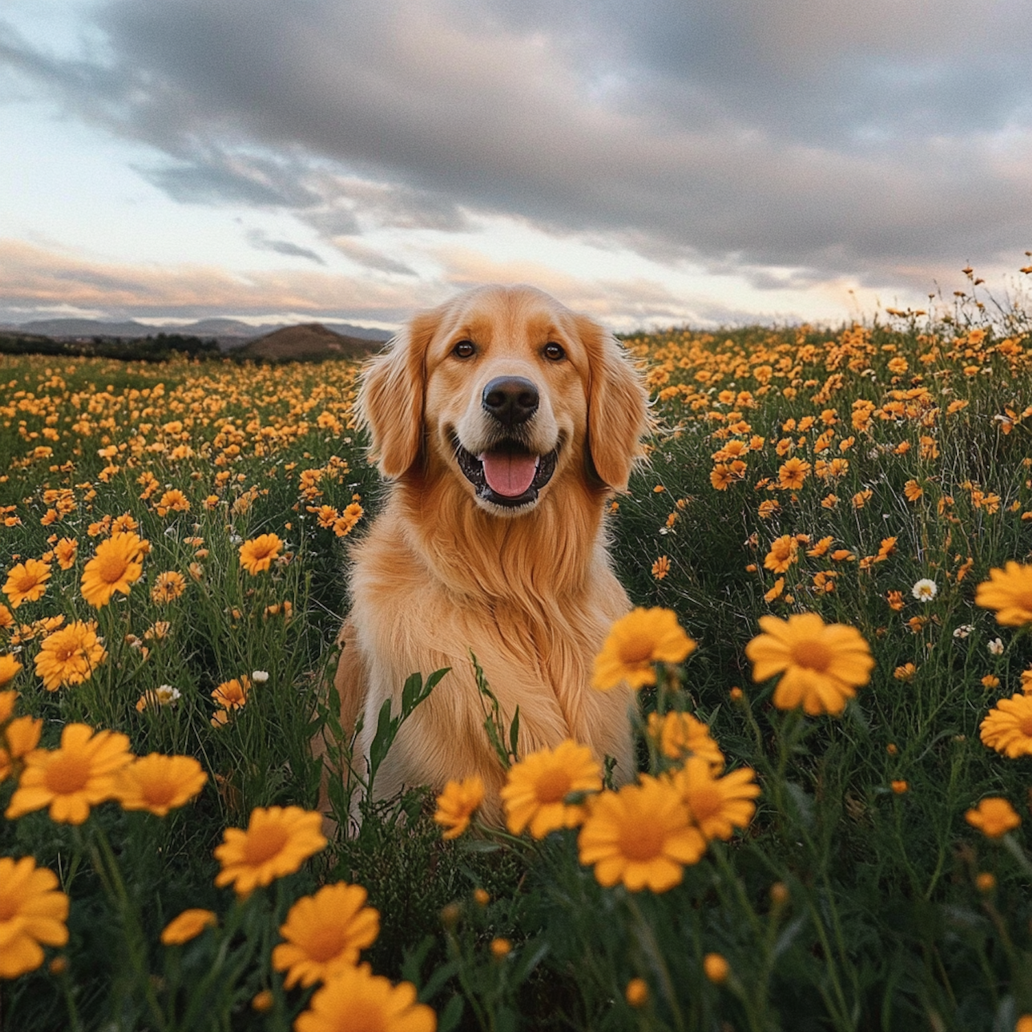 Golden retriever joyfully sitting in a field of vibrant yellow flowers under a partly cloudy sky, exuding happiness and serenity.
