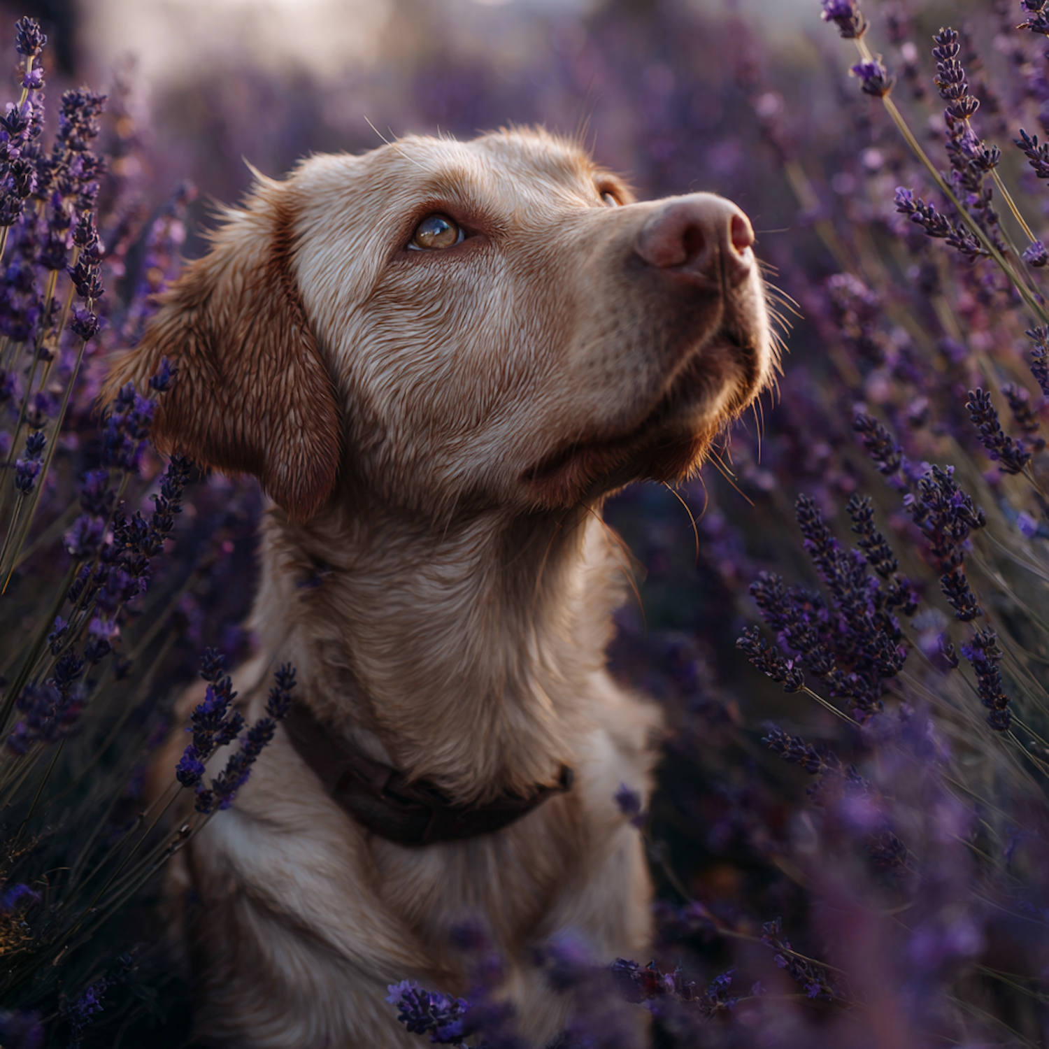 Golden retriever in a lavender field, gazing upward with a serene expression, surrounded by vibrant purple blossoms.