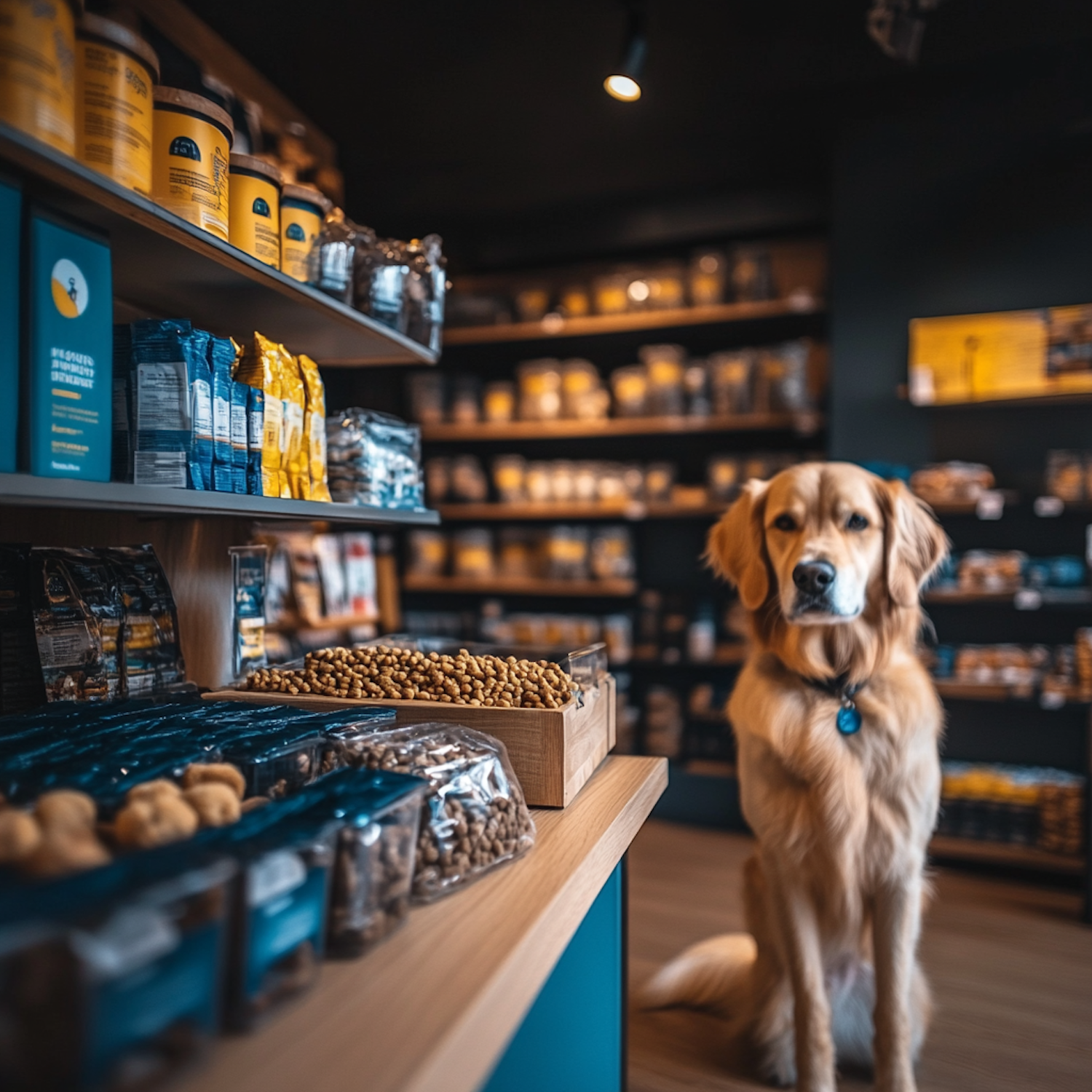 Golden retriever in a pet store surrounded by neatly organized pet food and treats, creating a cozy shopping atmosphere.