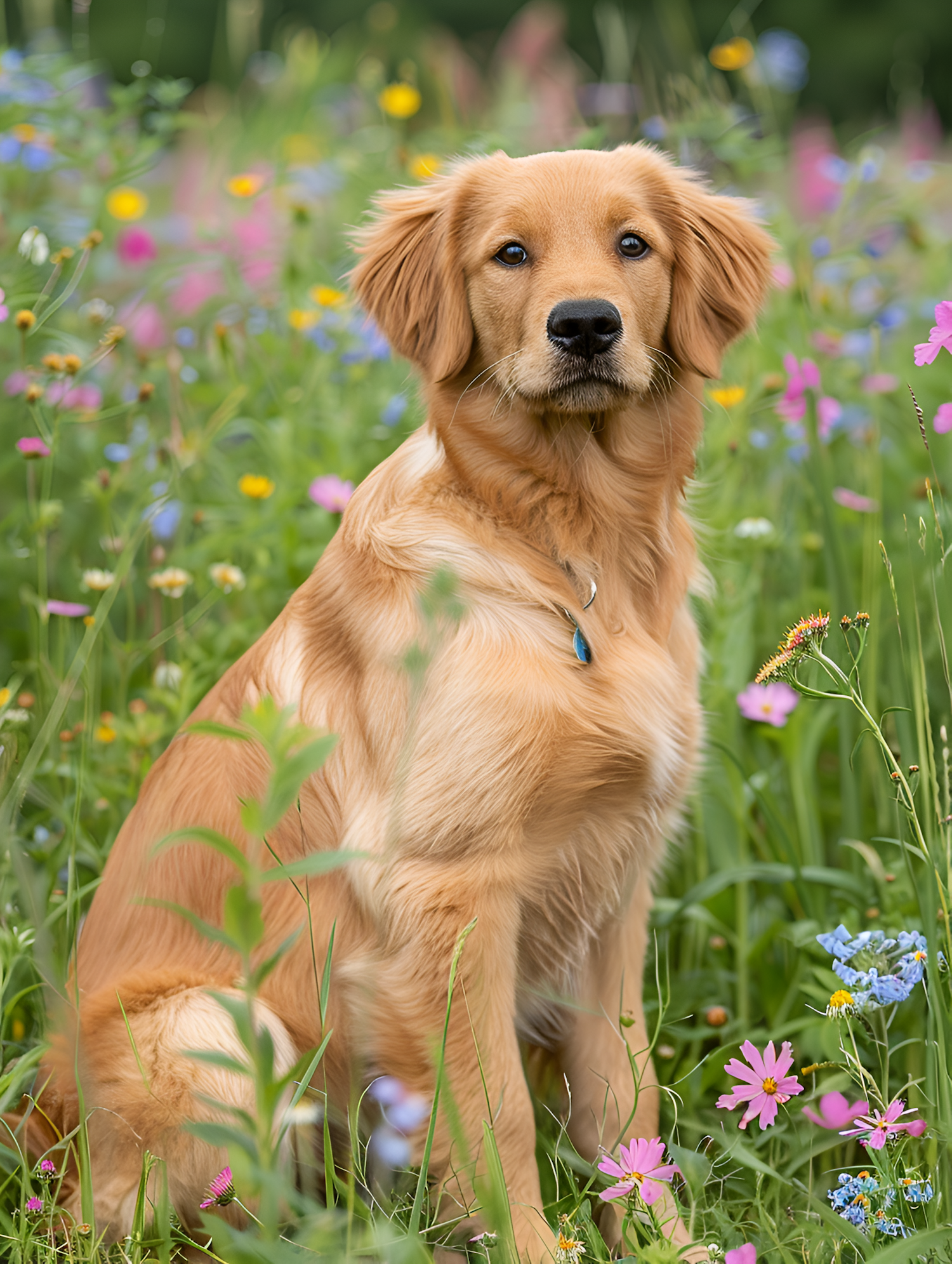 Golden retriever sitting in a colorful wildflower field, surrounded by vibrant blooms and lush greenery.