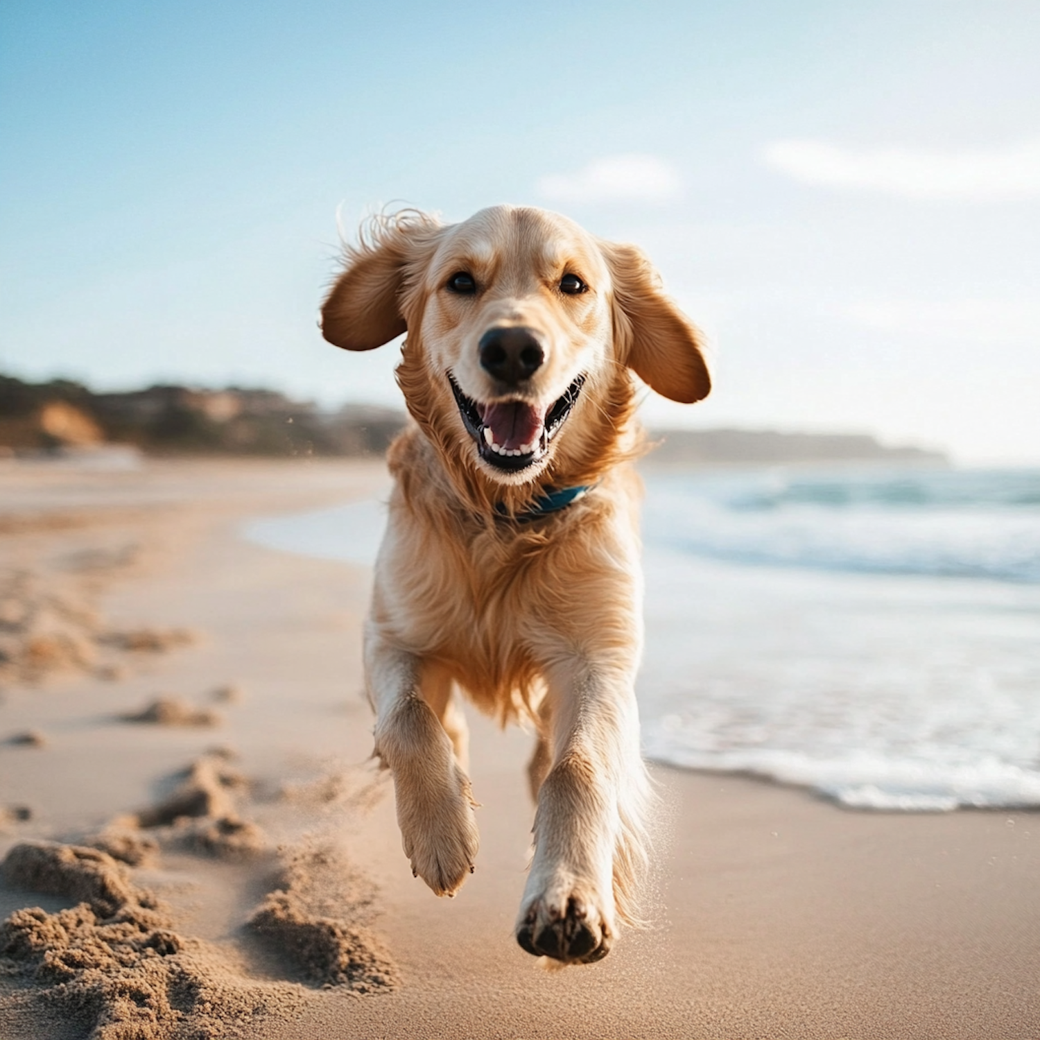 Golden Retriever joyfully running on a sunny beach, with ocean waves and blue sky in the background.