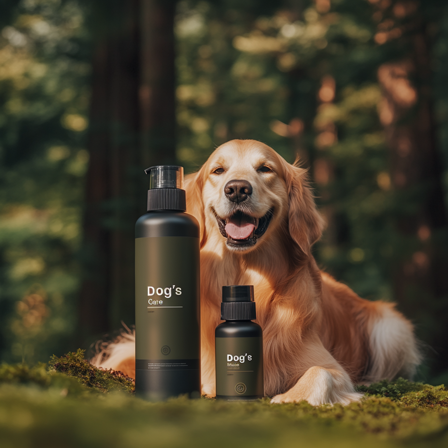 Golden retriever in a forest with "Dog's Care" pet products, showcasing natural grooming essentials in a serene outdoor setting.